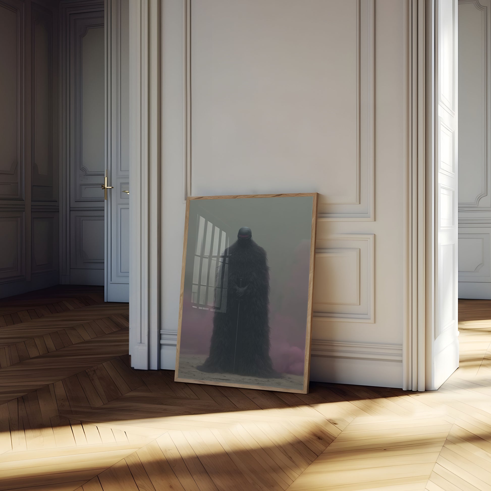 A haunting figure emerges from dense fog, draped in a thick black fur cloak and wearing a sleek black helmet with a mysterious pink accent. The enigmatic character stands solemnly, gripping a vertical staff, surrounded by soft pink and gray mist that creates an otherworldly atmosphere. This surreal artwork blends elements of science fiction and fantasy into a mesmerizing visual experience.