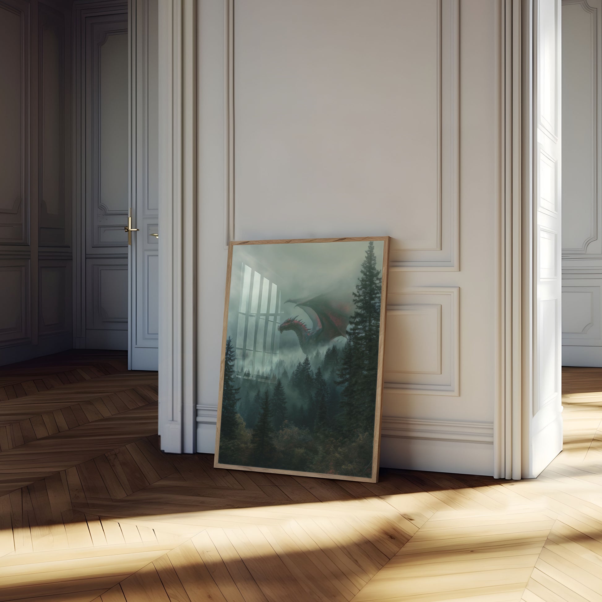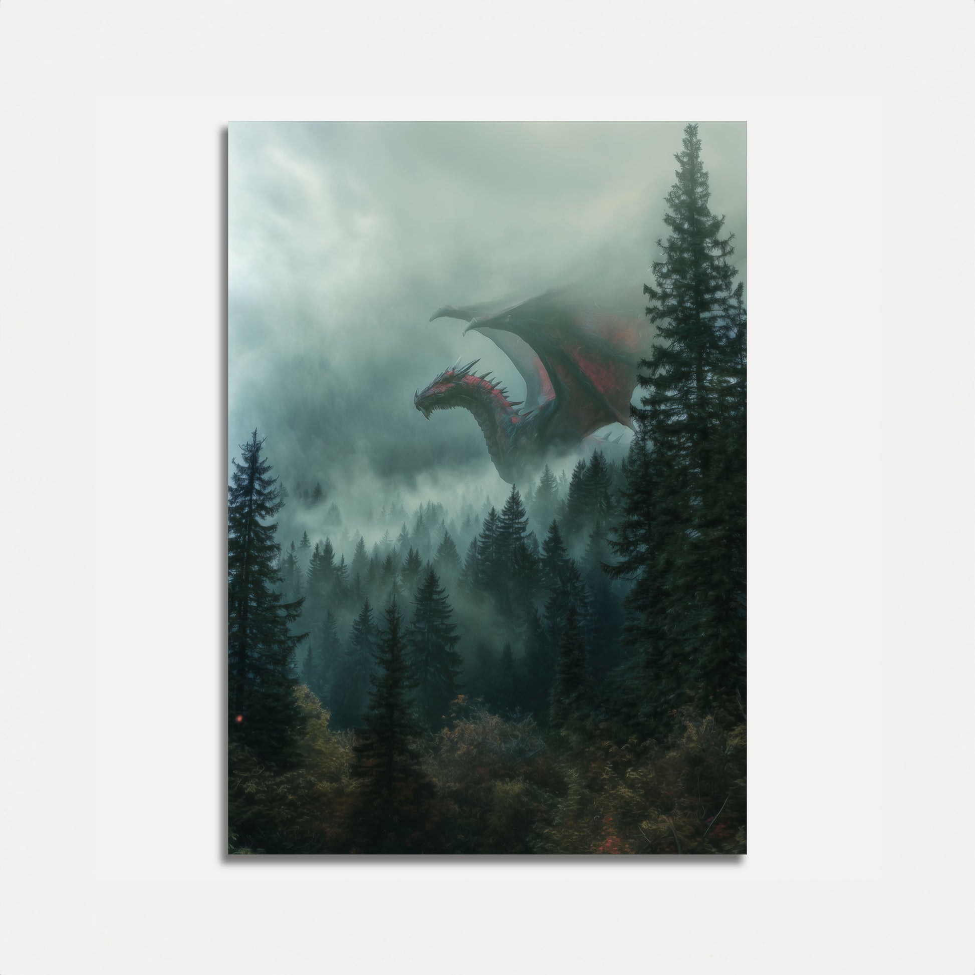 Immerse yourself in a haunting fantasy landscape where a fierce dragon emerges from ethereal mist and ancient pine forests. Shrouded in cool green and gray tones, this dramatic artwork captures the mysterious essence of mythical wilderness, with a powerful winged creature soaring above a dense, fog-laden woodland.