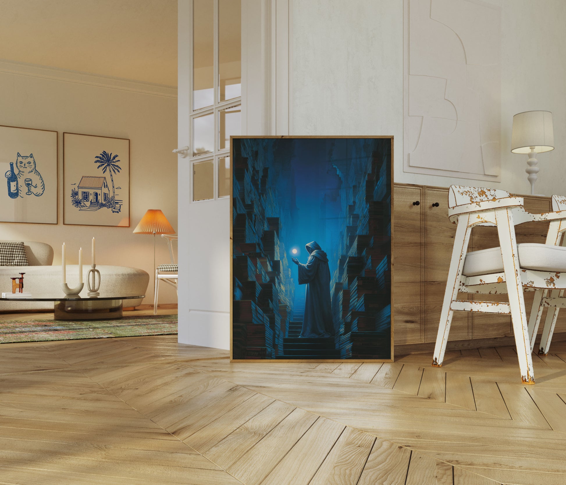 This hauntingly beautiful artwork captures a solitary hooded figure standing amidst towering urban buildings under a luminous night sky. The deep blue color palette creates an atmosphere of mystery and spiritual contemplation, with the glowing orb of light hovering above symbolizing hope, enlightenment, or inner wisdom. The dramatic perspective and architectural details draw you into a scene that feels both dreamlike and deeply introspective, perfect for those seeking meaningful wall art that sparks conversation and reflection.