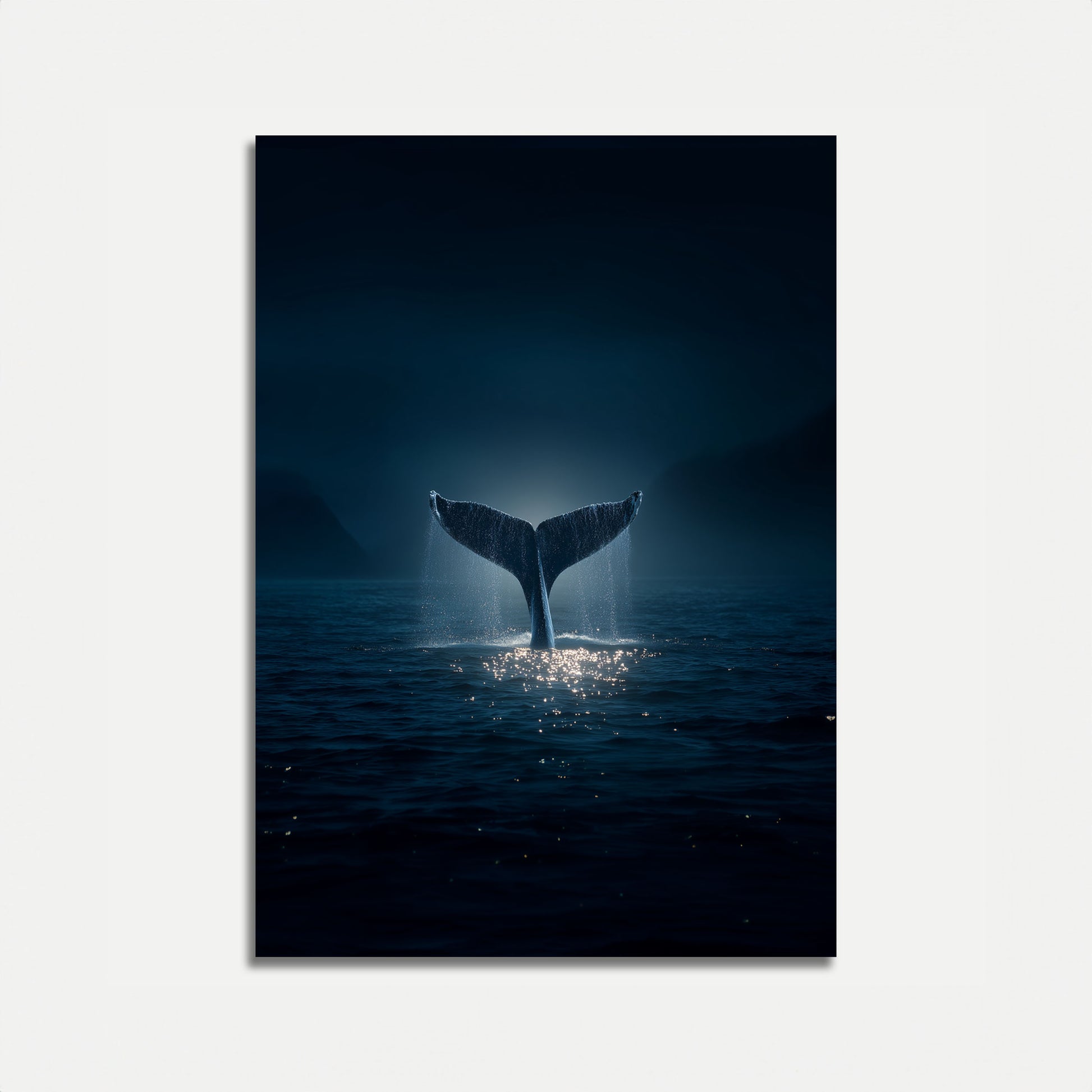A breathtaking moment captured in the depths of the ocean, this poster showcases a majestic whale tail emerging from dark, moody waters. Illuminated by a soft, ethereal light, the image creates a sense of wonder and tranquility, with sparkling water droplets dancing around the powerful silhouette.