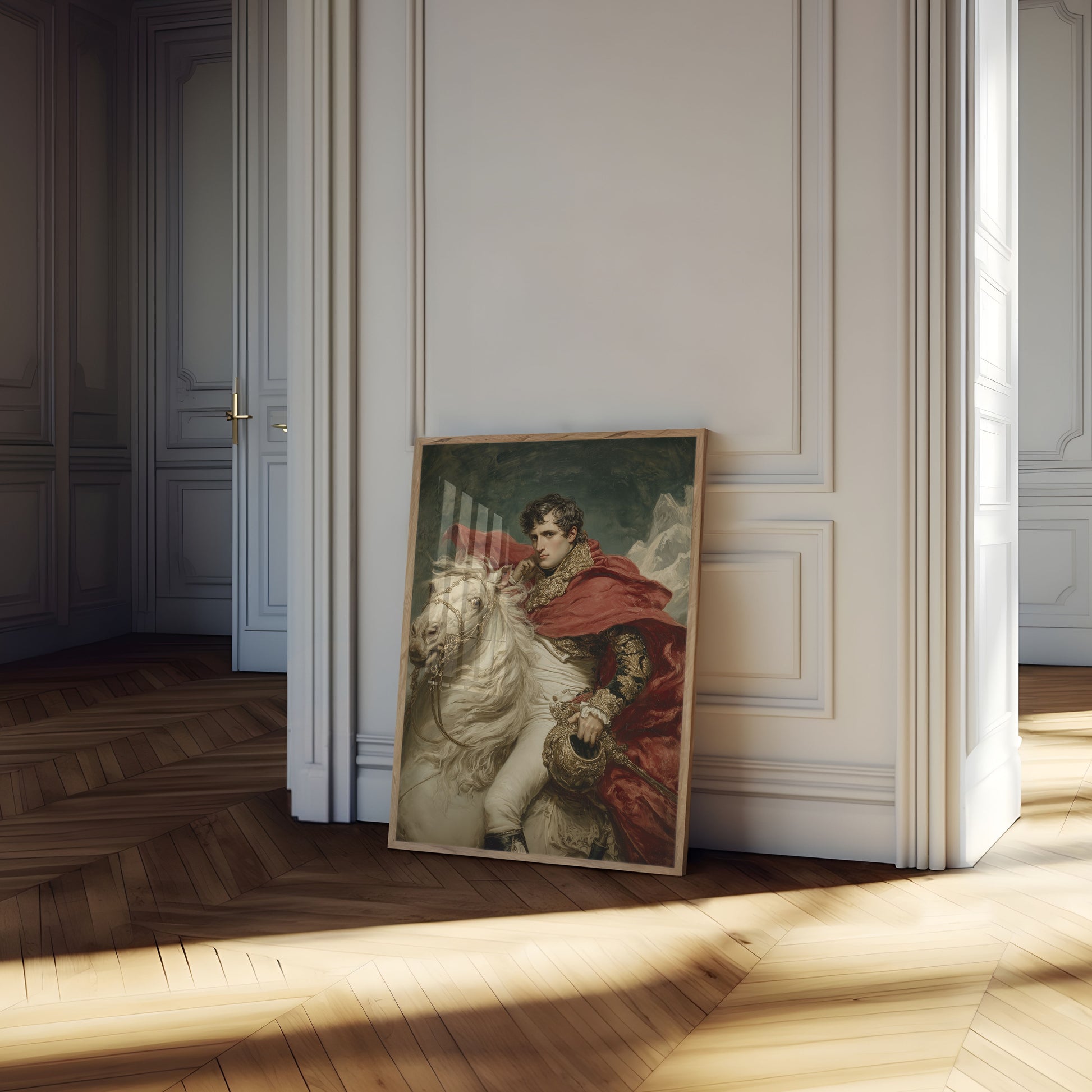 Experience the raw power and regal elegance of this stunning portrait featuring a commanding figure astride a magnificent white stallion. The dramatic red cape and intricate golden embellishments capture the heroic essence of a legendary leader against a misty mountain backdrop. This iconic image blends historical grandeur with artistic magnificence, bringing a timeless sense of strength and nobility to any space.