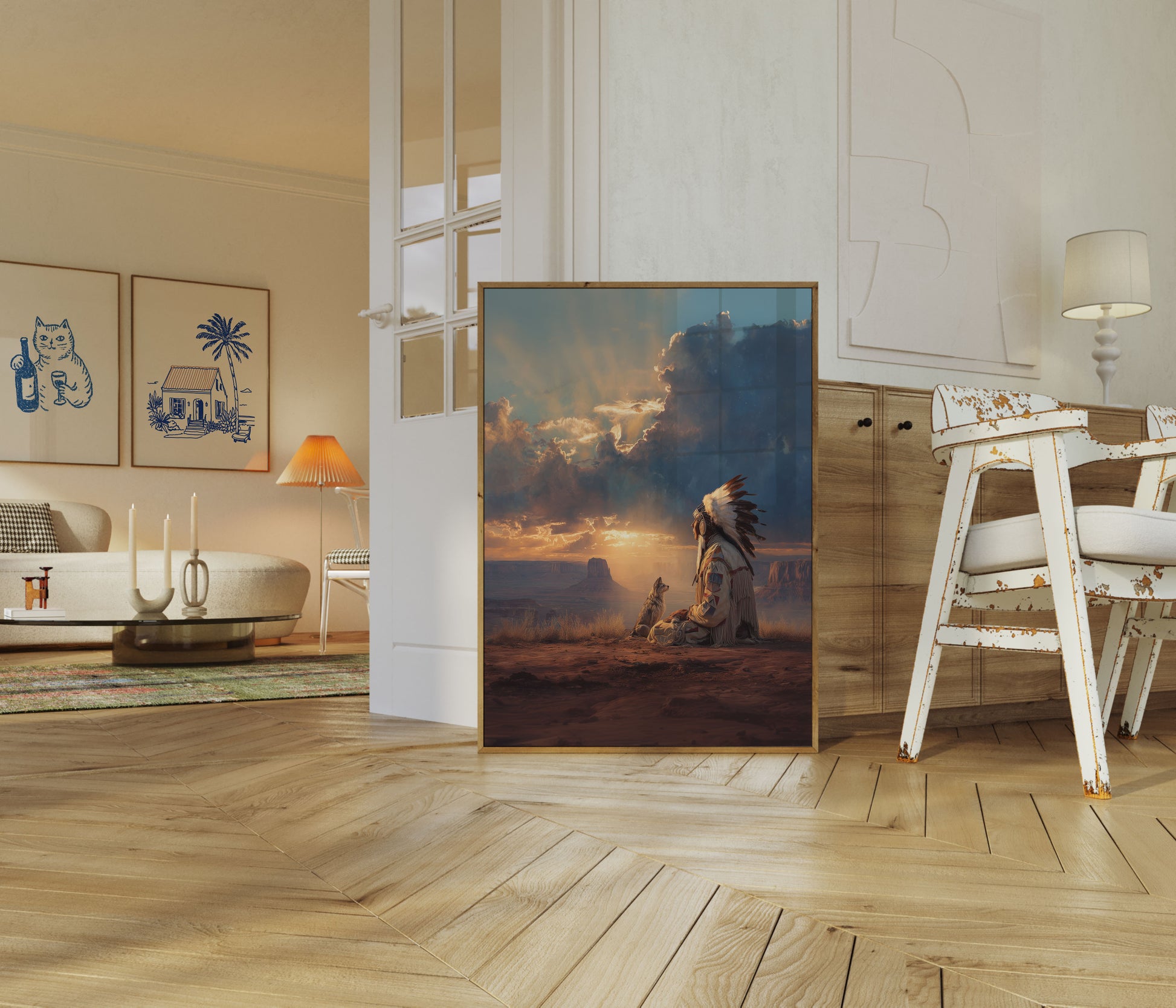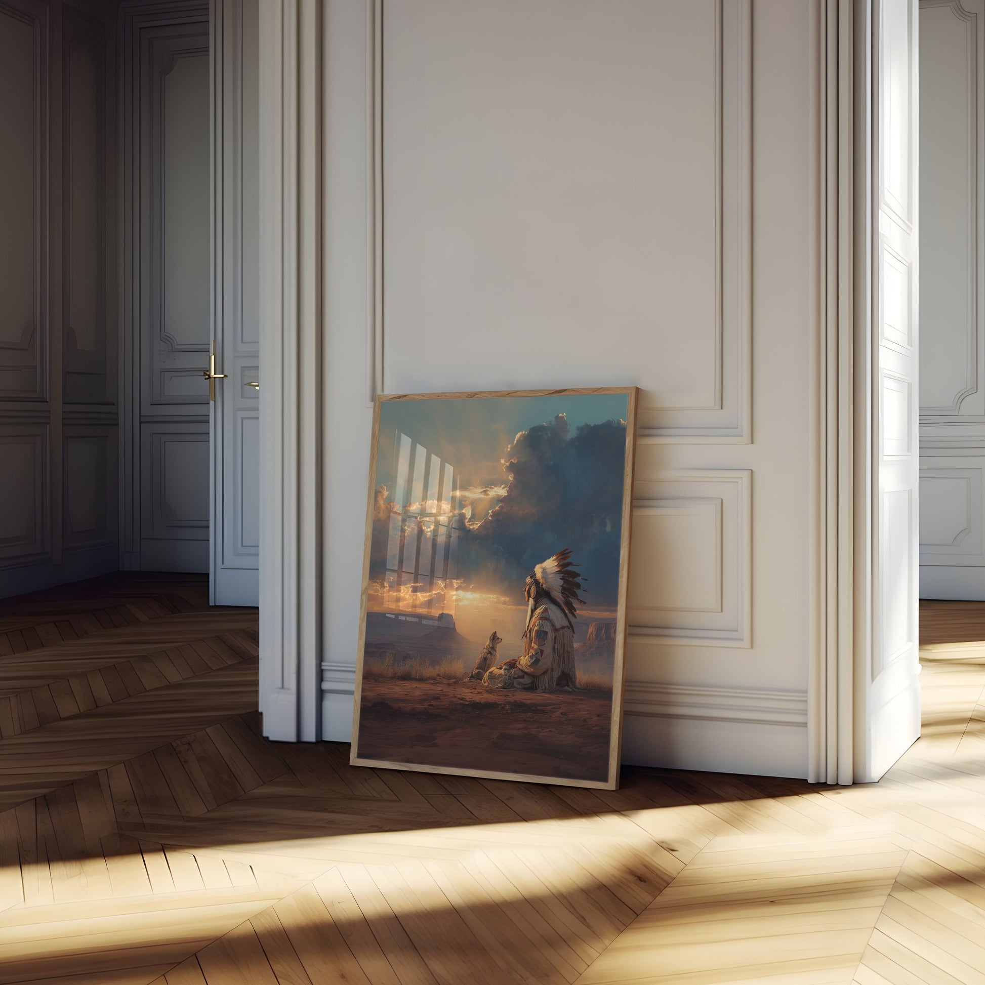 Immerse yourself in the profound spiritual connection between a Native American chief and his wolf companion, set against the breathtaking backdrop of Monument Valley. This stunning artwork captures a moment of profound reverence, with dramatic storm clouds parting to reveal a golden sunset that illuminates the sacred landscape. The intricate details of the traditional headdress, the wolf's loyal stance, and the majestic rock formations create a powerful narrative of harmony between humanity, nature, and the spiritual world.