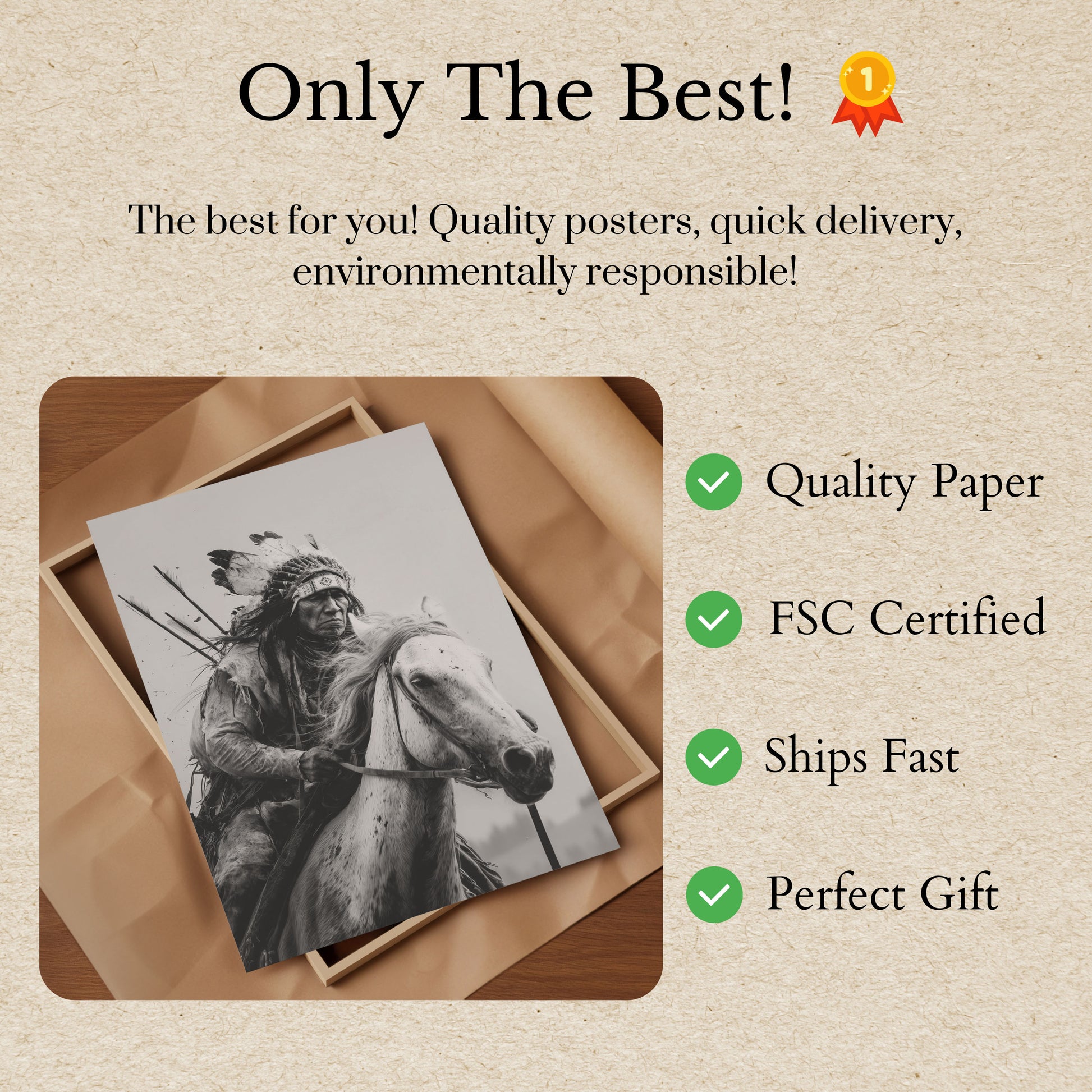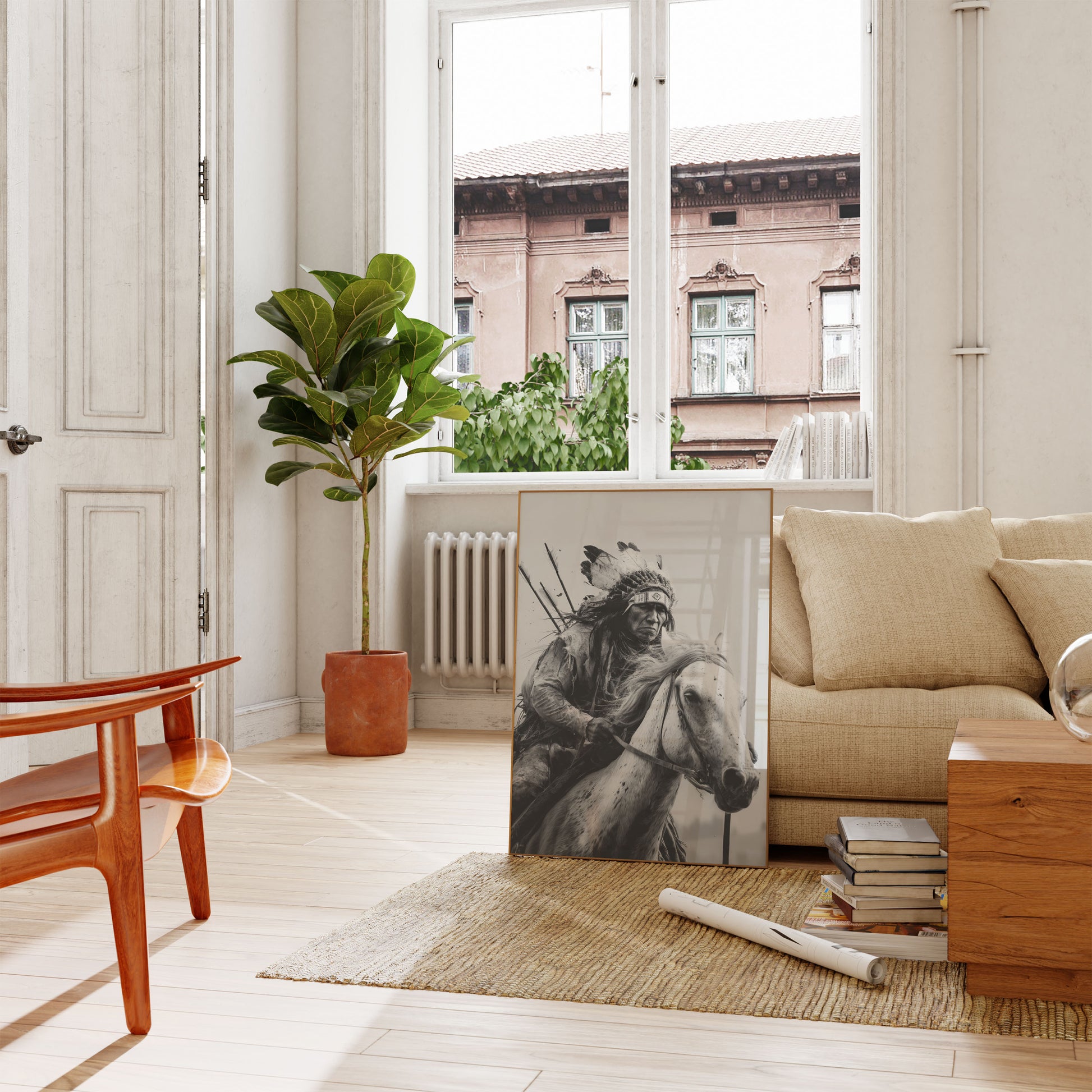 A powerful black and white portrait capturing a Native American chief in full traditional headdress, riding a striking white horse. The intense gaze and windswept feathers convey a sense of strength, dignity, and timeless cultural heritage. This dramatic image portrays the spirit of Native American leadership and connection to horse culture.