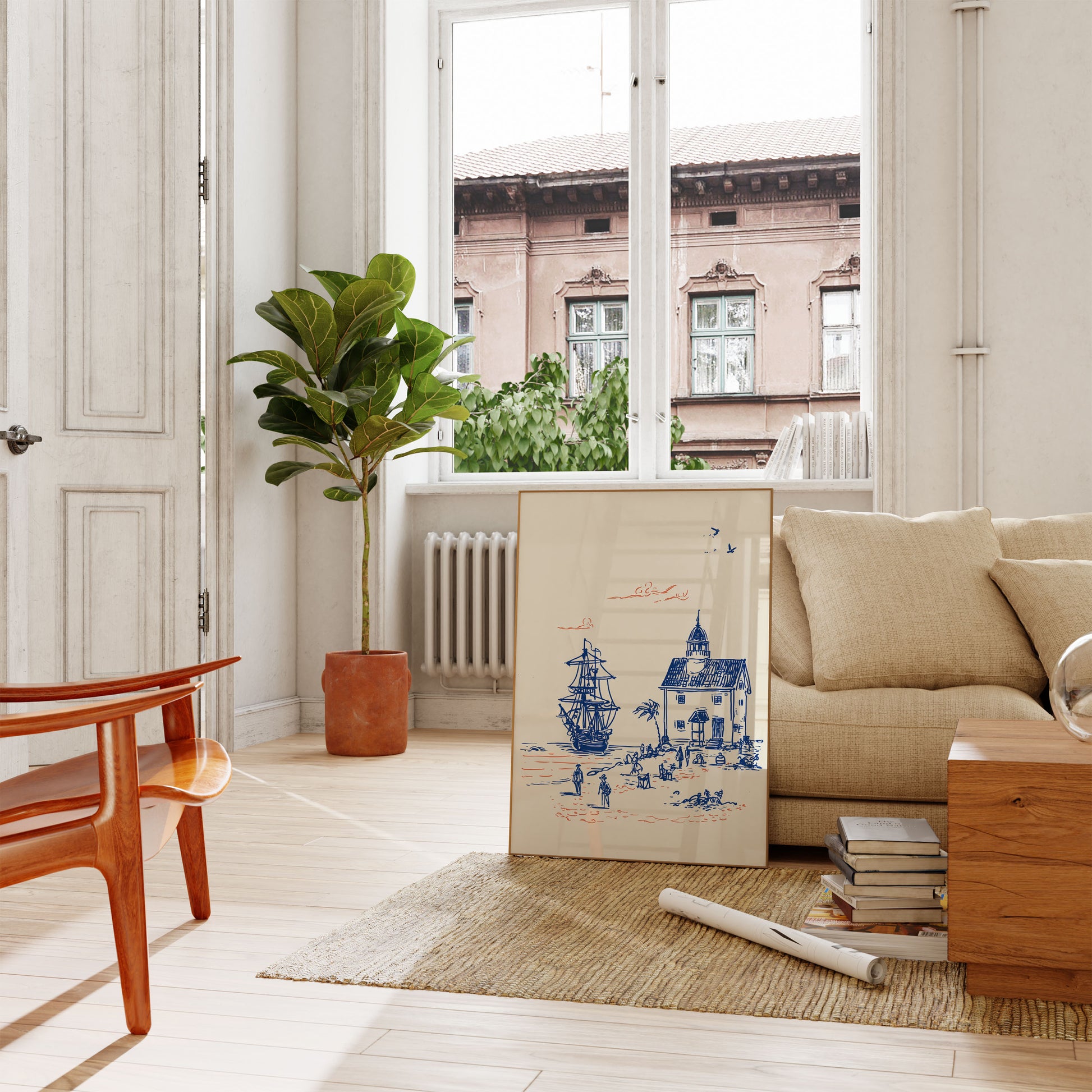 Dive into a nostalgic maritime adventure with this stunning blue and coral vintage illustration. The detailed sketch captures a classic sailing ship anchored near a coastal house, with figures moving along the shoreline and birds soaring overhead. This artistic rendering evokes the romantic spirit of maritime exploration and coastal life.