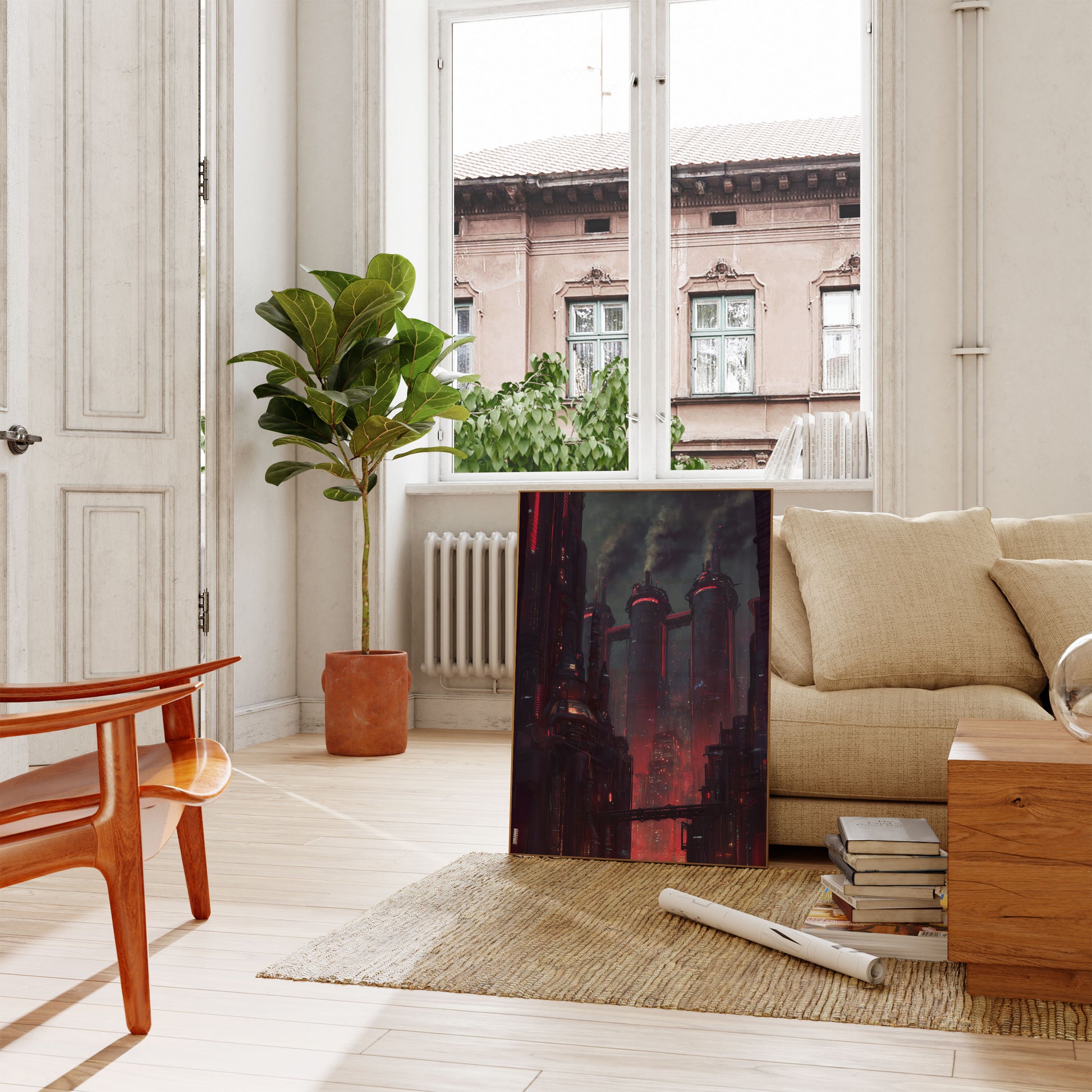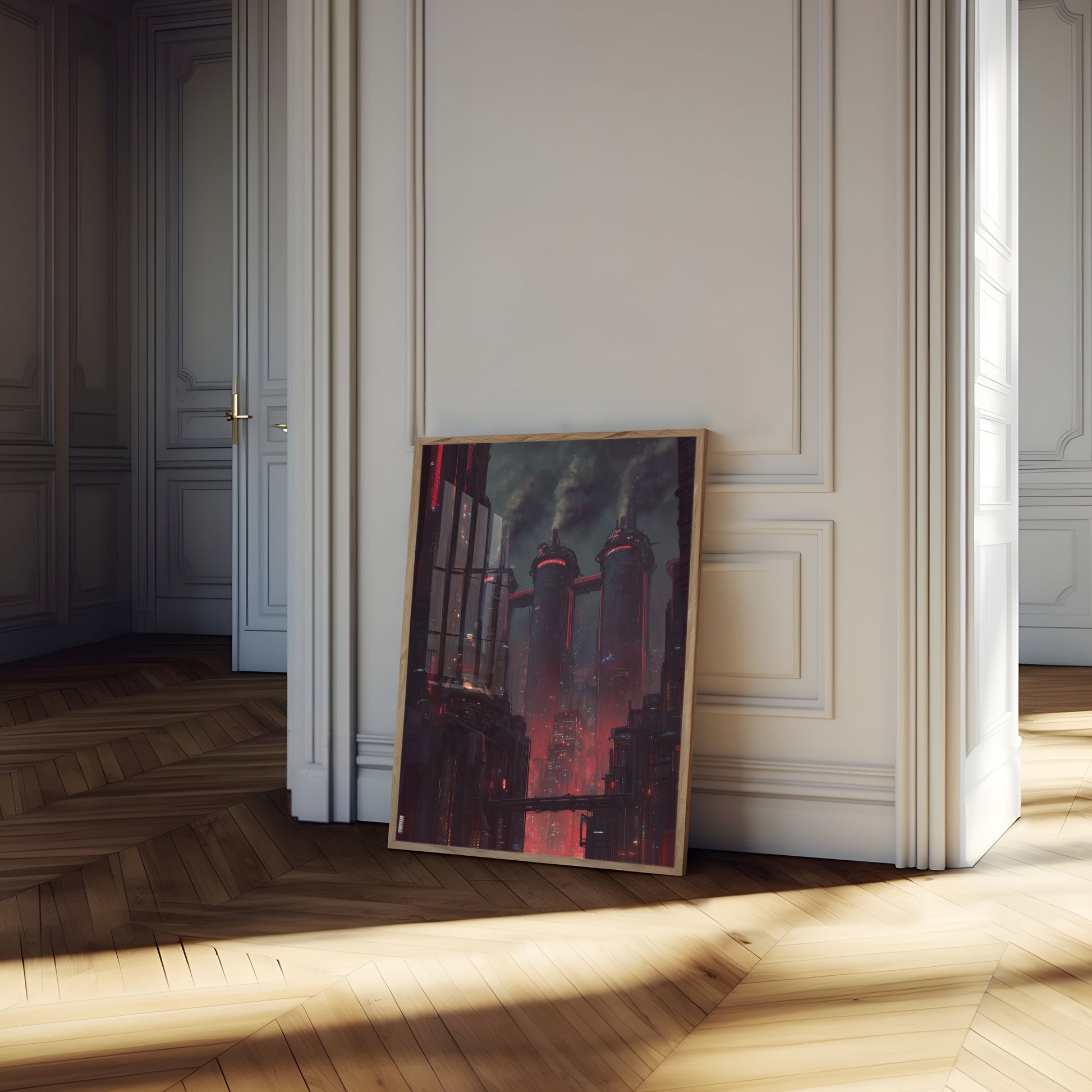 Step into a dystopian future with this stunning cyberpunk cityscape that pulses with electric red and neon energy. Towering industrial structures rise through thick, smoky clouds, their surfaces glowing with vibrant crimson light that reflects the gritty, high-tech atmosphere of an imagined metropolis. This dramatic sci-fi artwork captures the essence of a dark, futuristic world where technology and decay coexist in perfect visual harmony, creating an immersive and mesmerizing scene that commands attention on any wall.