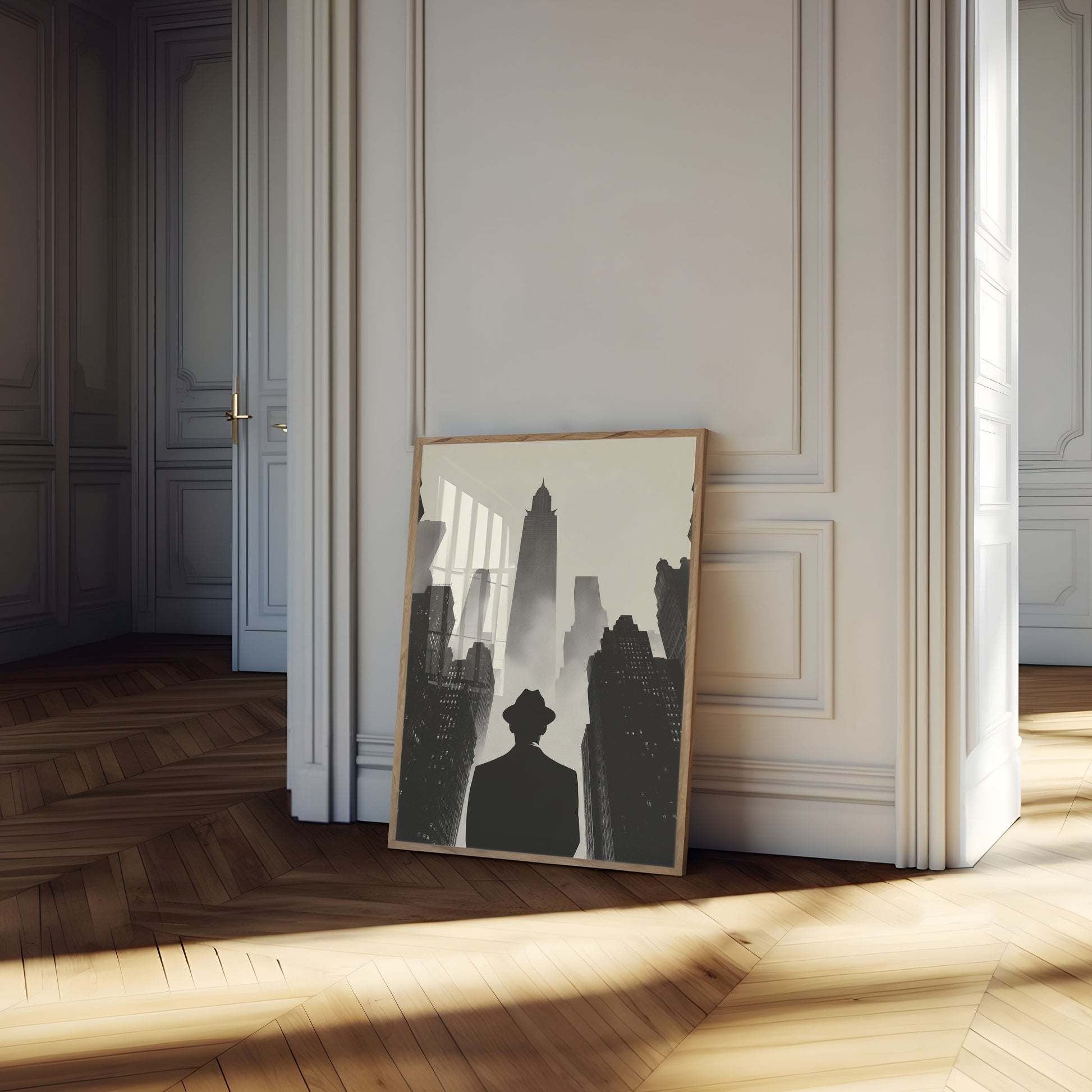 A mesmerizing black and white cityscape capturing the iconic skyline of New York City, with a mysterious silhouetted figure standing before towering skyscrapers. The dramatic perspective showcases the Chrysler Building amid a sea of architectural giants, creating a moody and atmospheric urban landscape that speaks to the city's grandeur and anonymity.