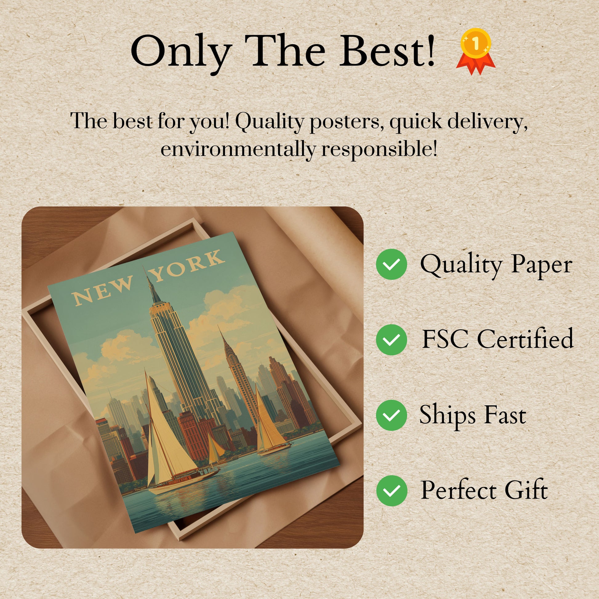 Immerse yourself in the timeless beauty of New York City with this stunning vintage-style poster featuring iconic skyscrapers and elegant sailboats. The soft, warm color palette captures the city's magical golden hour, with the Empire State Building and Chrysler Building standing tall against a dreamy teal sky. Sailboats glide gracefully across the water, creating a serene contrast to the bustling urban landscape.