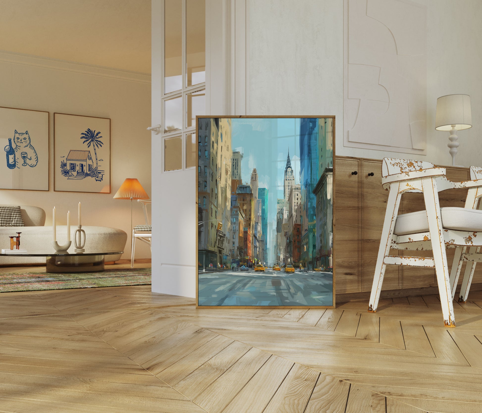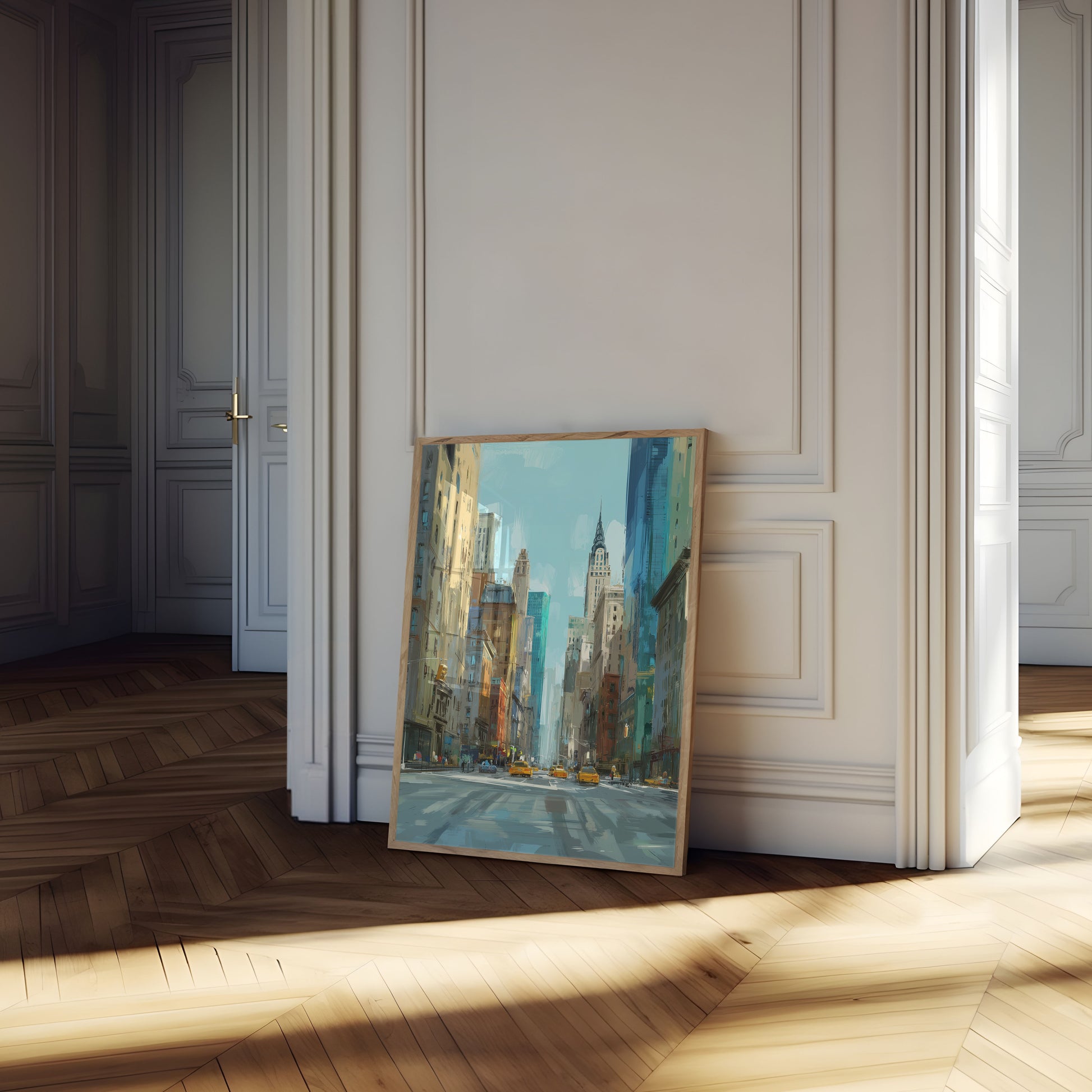 Immerse yourself in the vibrant energy of New York City with this stunning cityscape illustration. Capturing the iconic skyline with soft, impressionistic brushstrokes, the artwork showcases yellow taxis, towering skyscrapers, and the legendary Chrysler Building against a serene blue sky. The painting beautifully blends architectural details with a dreamy, atmospheric color palette that brings the city's dynamic spirit to life.