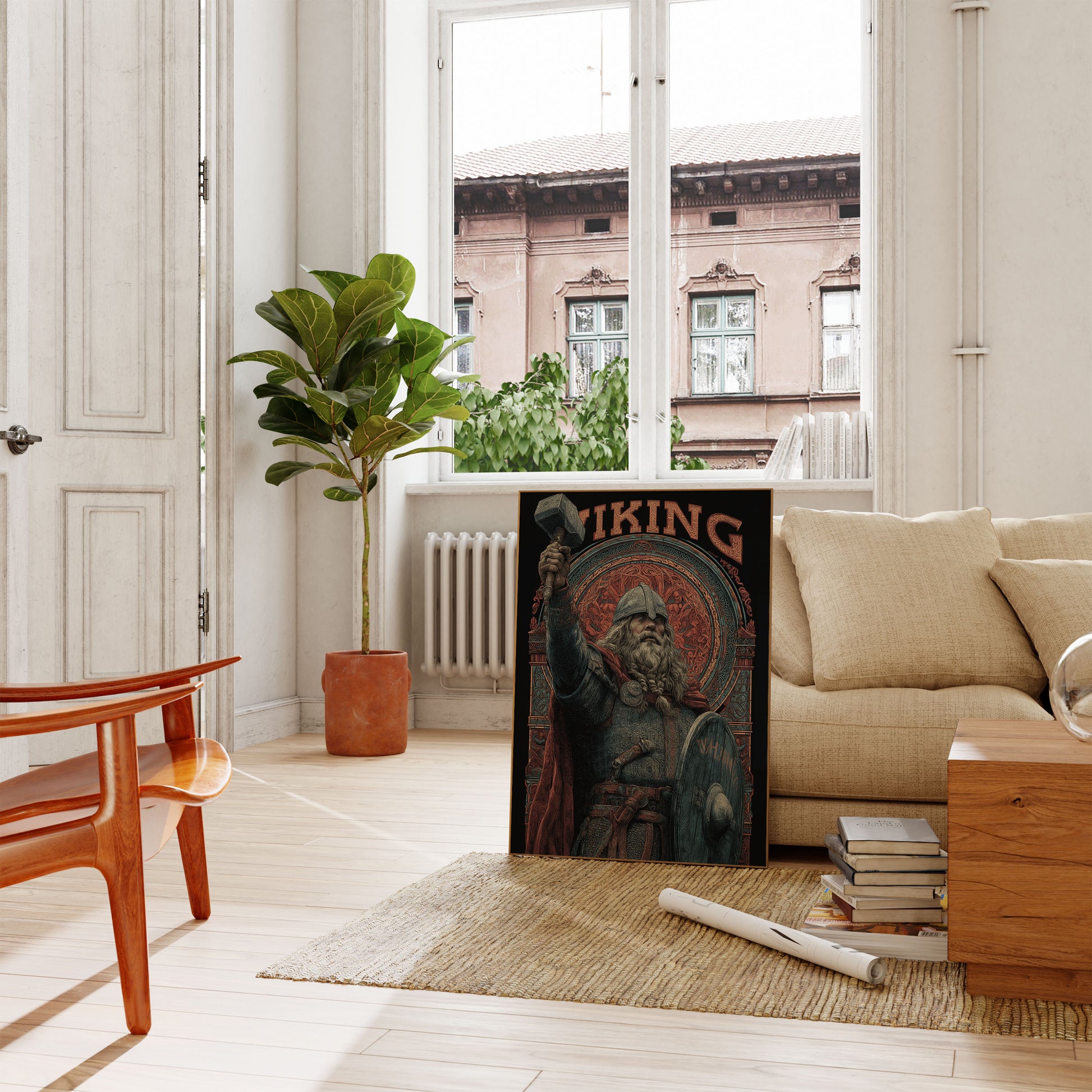 Step into the epic world of Viking mythology with this intricate and powerful illustration of a legendary Norse warrior. Adorned in detailed chainmail and a weathered helmet, the figure stands tall, wielding a massive hammer against a backdrop of stunning Celtic-inspired ornamental designs. Rich terracotta and teal tones create a dramatic and immersive visual experience that captures the raw strength and mystique of Viking culture.