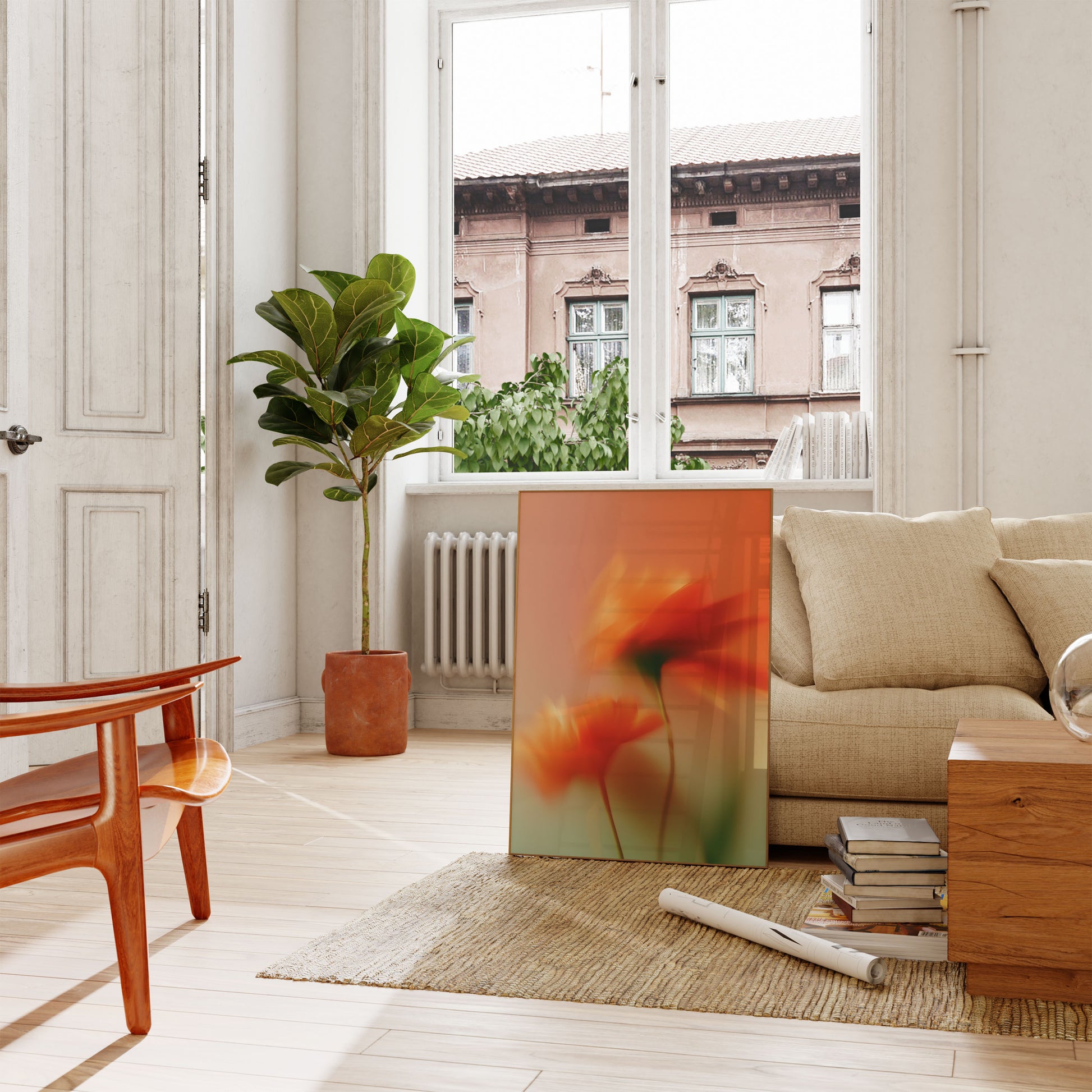 A mesmerizing abstract capture of delicate flowers in soft, dreamy orange and red hues. The image creates a sense of gentle movement, with blurred petals and stems dancing across a warm, gradient background. Soft edges and ethereal colors blur the lines between reality and imagination.