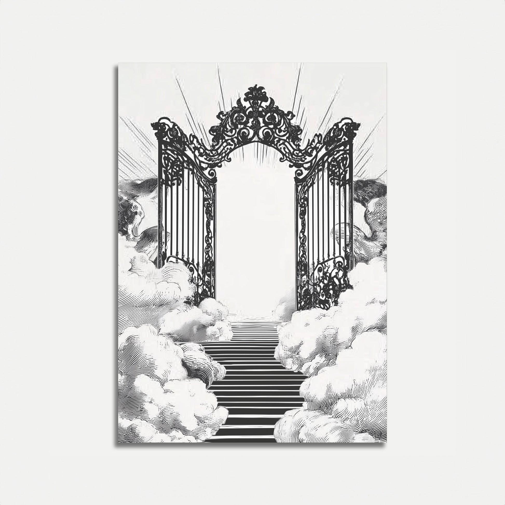 This stunning black and white illustration captures a majestic ornamental gateway shrouded in ethereal clouds, evoking a sense of divine transcendence and spiritual awakening. The intricate ironwork and baroque-inspired details create an atmosphere of mystery and wonder, while the dramatic perspective draws the viewer's gaze toward the luminous passage beyond. The contrast between the detailed metalwork and the soft, billowing clouds creates a contemplative mood that invites reflection on themes of paradise, eternity, and the journey between worlds.