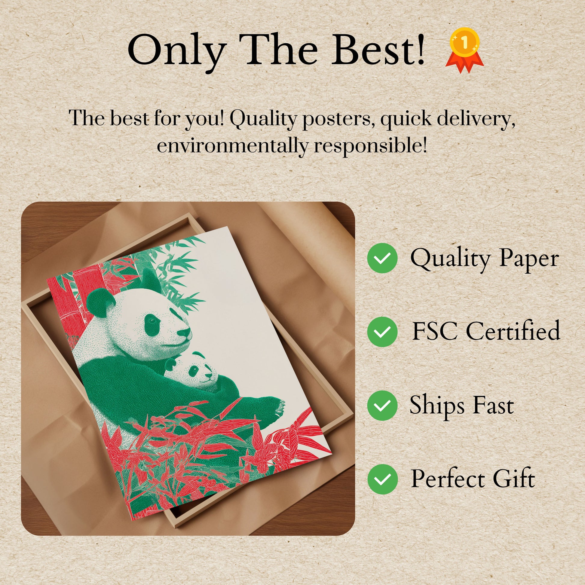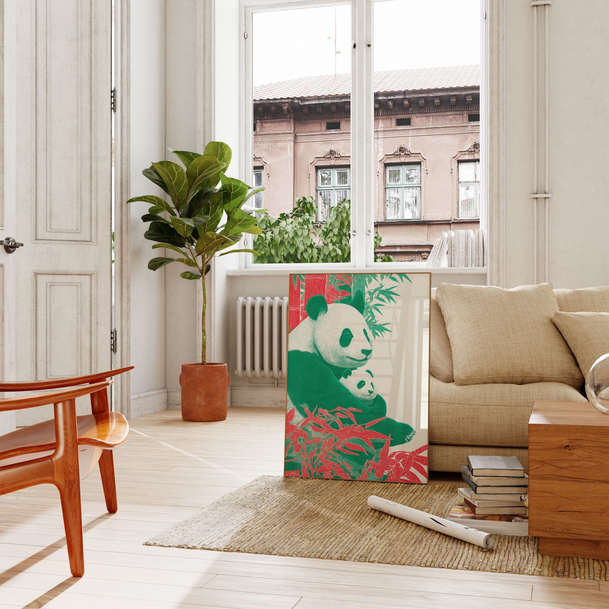 A stunning illustration captures the tender bond between a mother and baby panda nestled among vibrant red and green bamboo stalks. This artistic print brings the serene beauty of wildlife to life with its intricate line work and bold color palette. The delicate textures and intimate composition create a mesmerizing portrait of gentle nature.