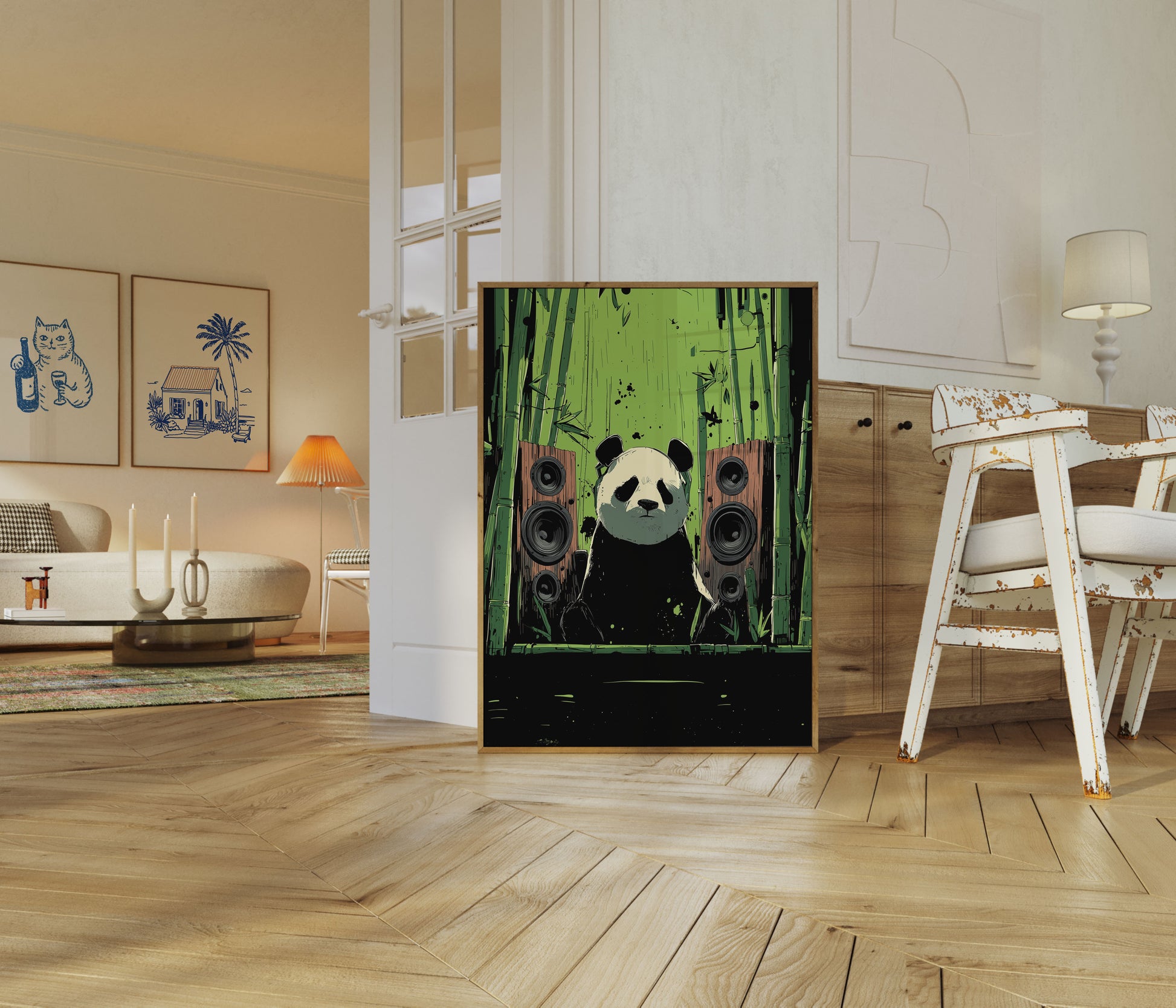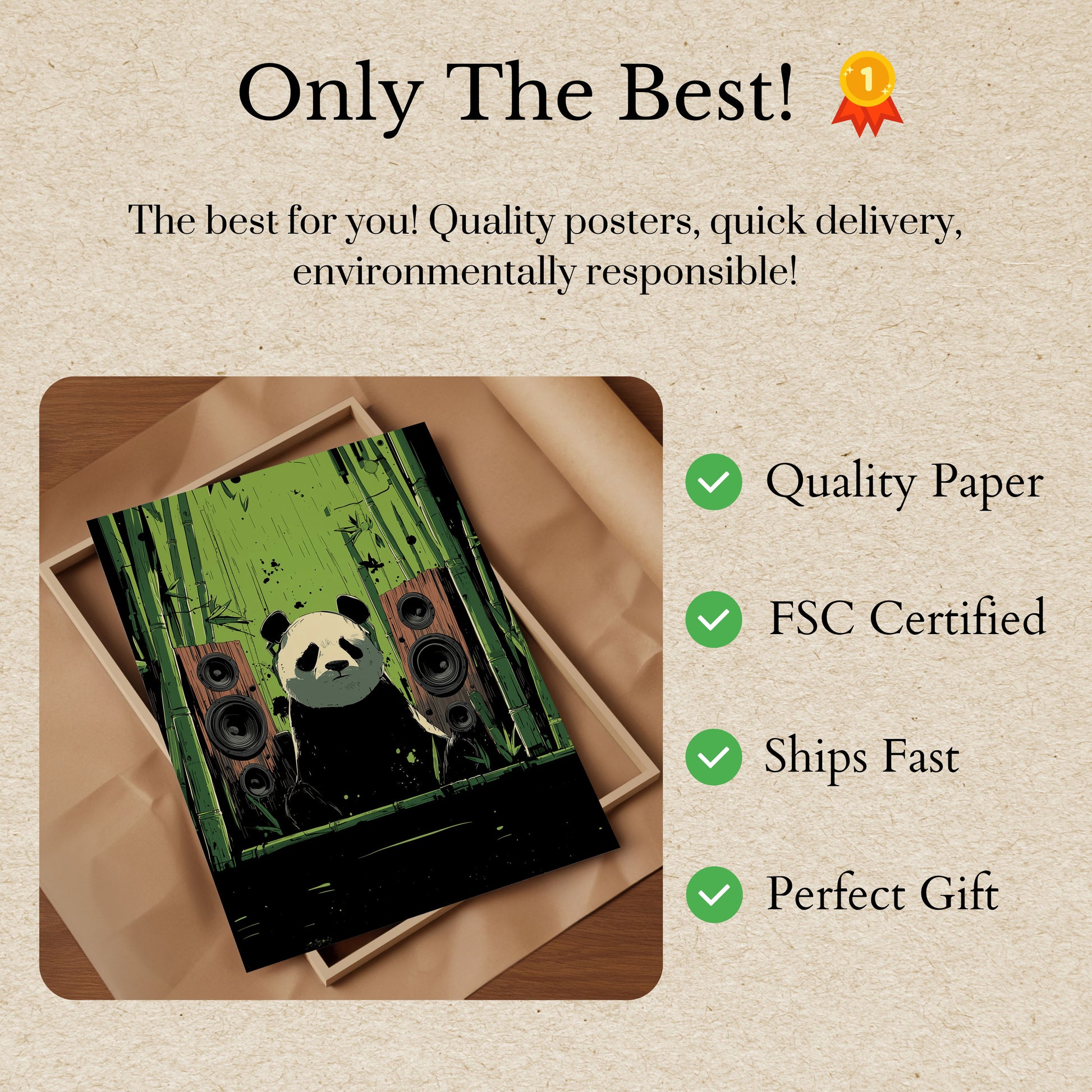 Immerse yourself in this electrifying urban jungle scene featuring a cool panda DJ surrounded by wooden speakers amidst a vibrant green bamboo forest. The artwork blends street art style with nature, creating a powerful visual symphony that captures the unexpected fusion of wildlife and music culture. Bold green tones and graphic design elements make this poster a statement piece for music and animal lovers alike.