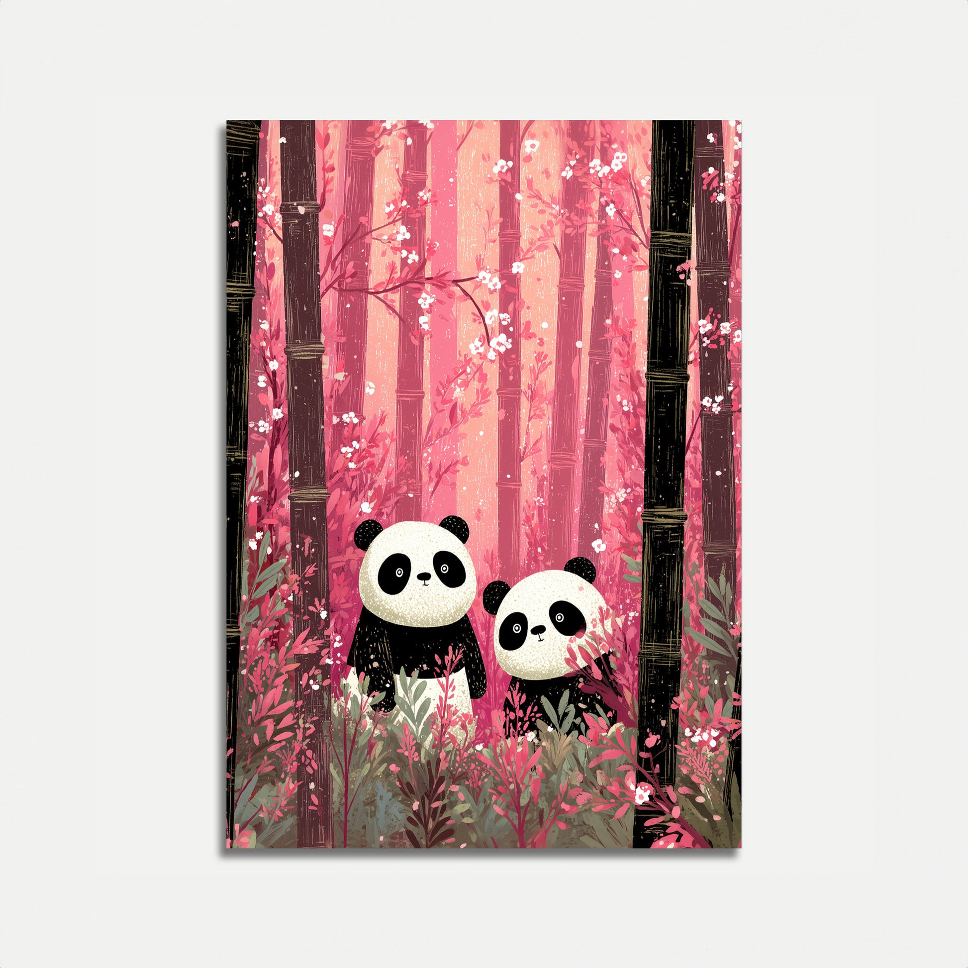 Two adorable pandas nestle among delicate pink bamboo forests, creating a serene and enchanting scene. Soft white blossoms dance through dreamy rose-hued trees, surrounding the cute bear friends in a magical woodland setting. The gentle illustration captures the tender connection between the pandas in their lush, romantic environment.