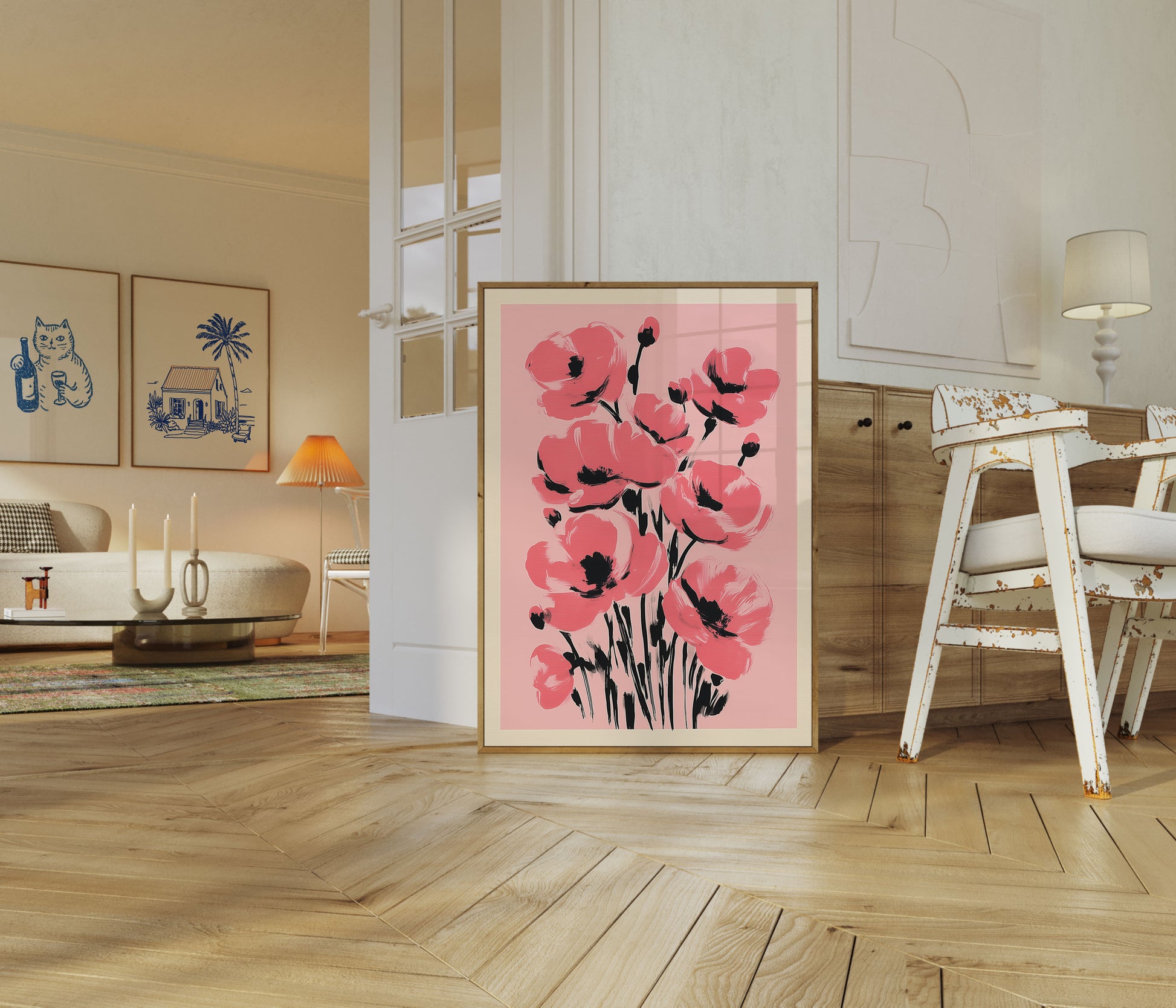 Delicate pink poppy flowers bloom against a soft blush background in this stunning artistic print. Bold black brushstrokes create elegant stems and define the floral silhouettes, bringing a sense of modern botanical charm to any space. The watercolor-inspired artwork captures the graceful movement and delicate petals of poppies with a contemporary, minimalist aesthetic.