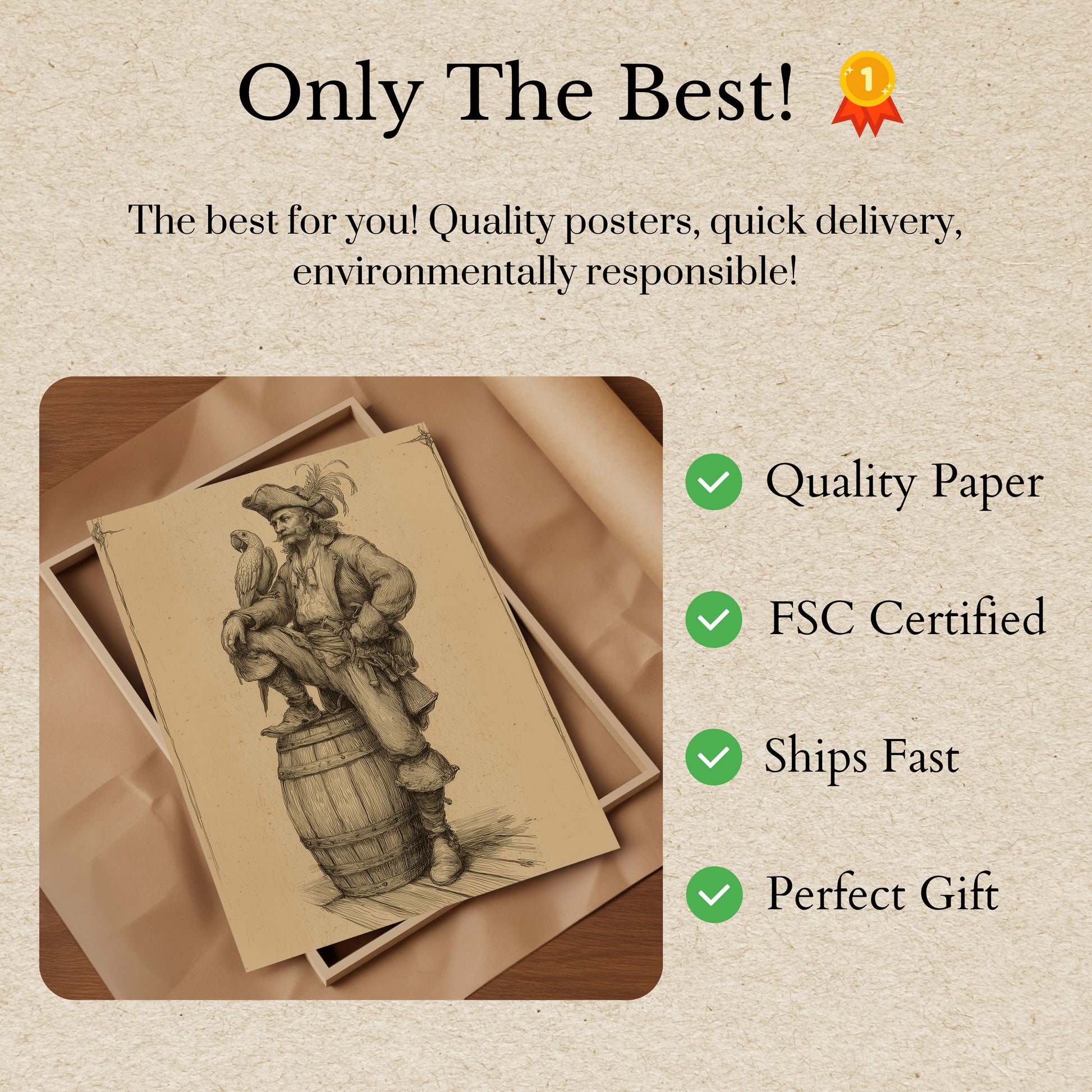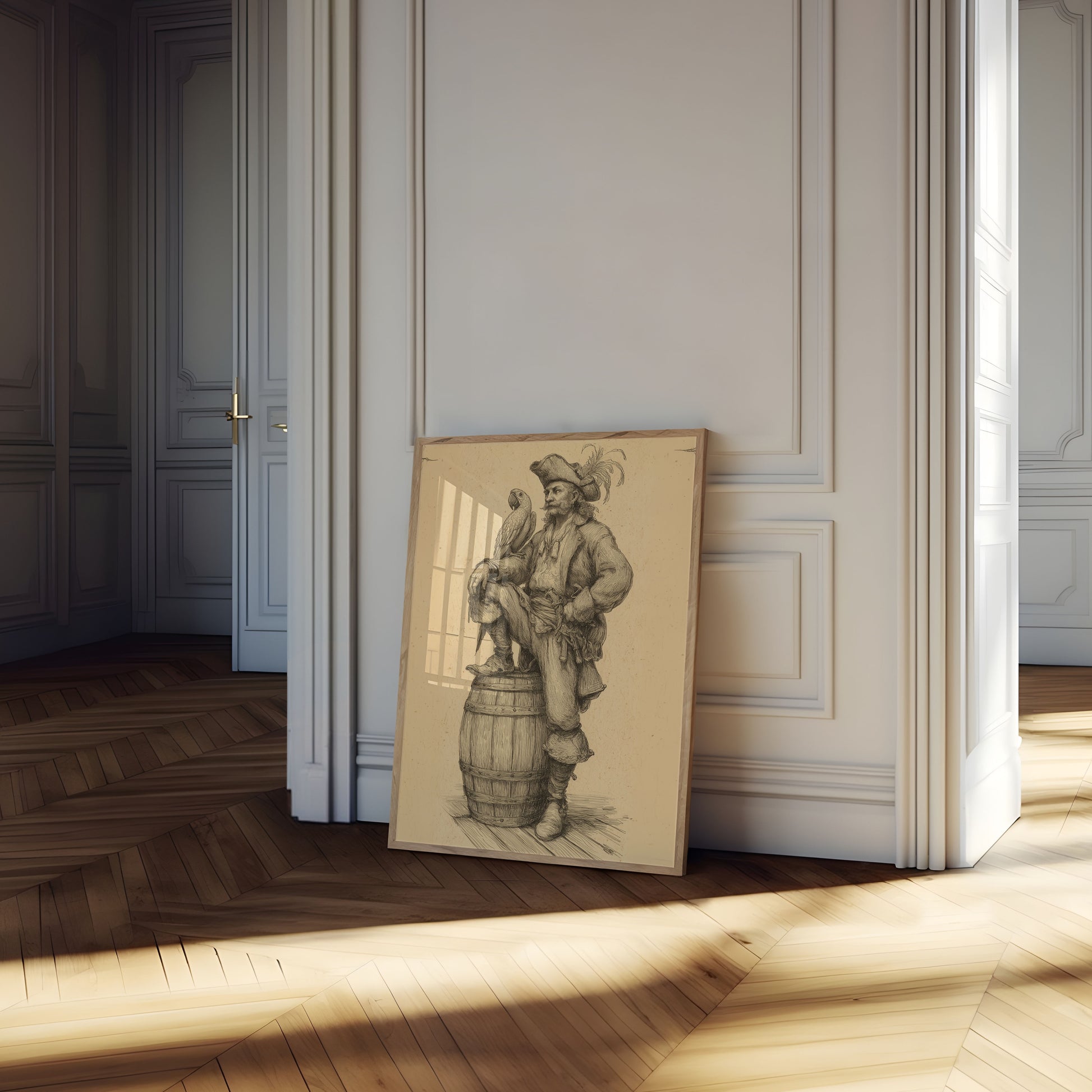 Immerse yourself in this exquisite vintage sketch of a dashing pirate standing confidently beside a wooden barrel, with a magnificent parrot perched at his side. The intricate details capture the rugged charm of a seafaring adventurer, adorned in a feathered hat and period-appropriate attire, creating a captivating scene that transports viewers to the golden age of exploration.