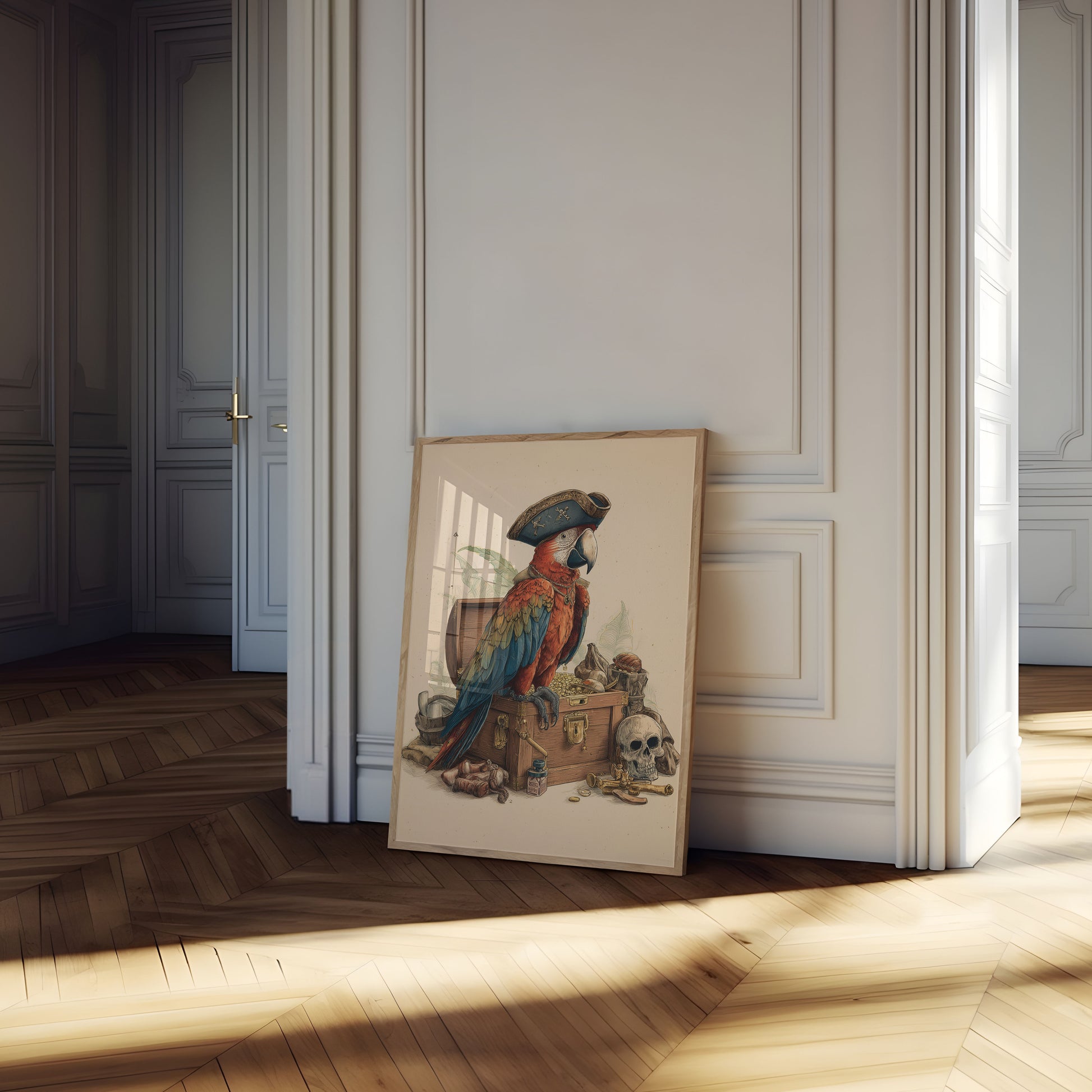 A stunning illustration of a vibrant scarlet macaw dressed as a classic pirate, perched atop a weathered treasure chest. Surrounded by nautical artifacts like a skull, cannon, and vintage bottles, this intricate artwork captures the adventurous spirit of high-seas exploration. Rich colors and meticulous detail bring this whimsical pirate scene to life with remarkable precision.