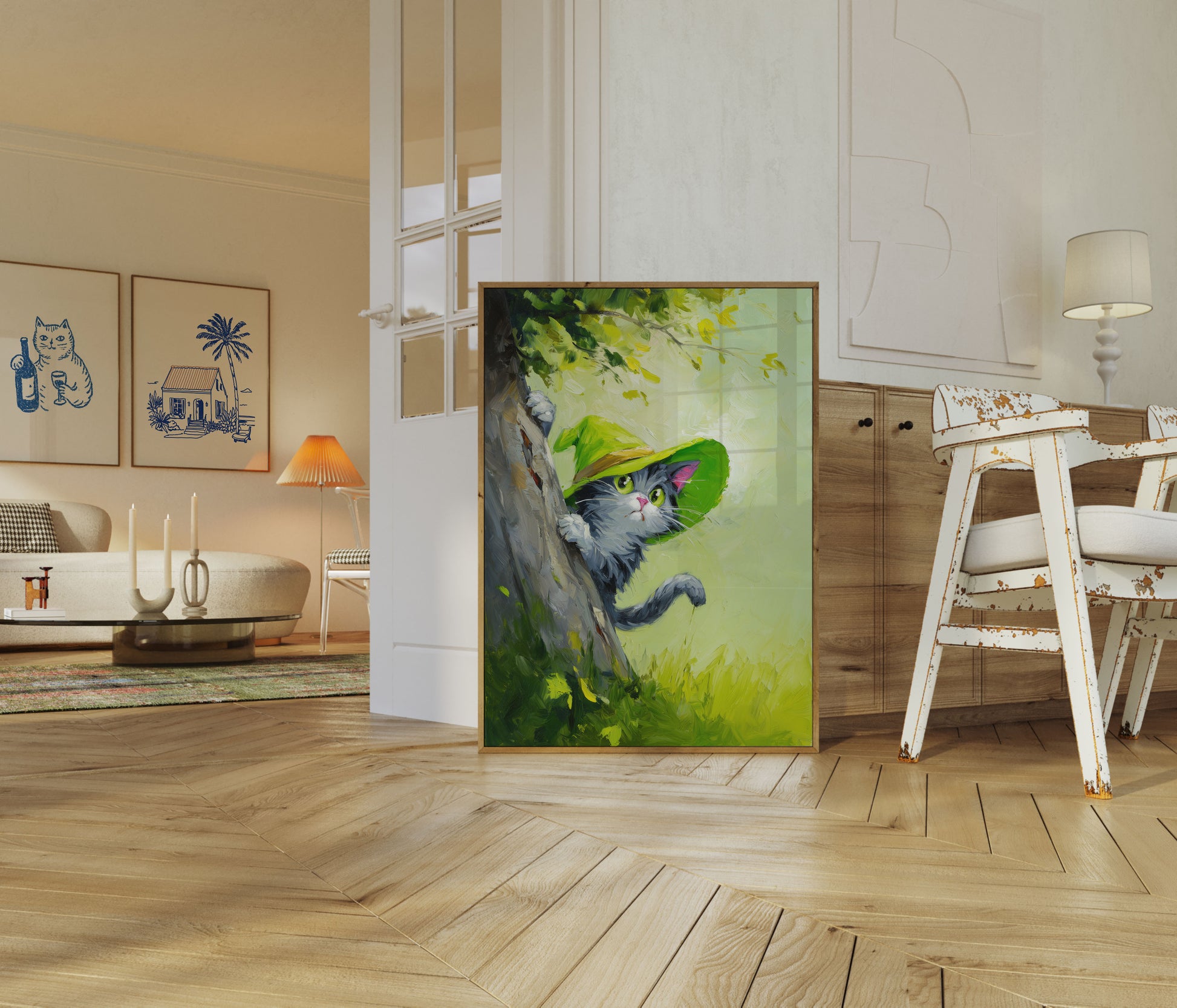 A charming oil painting captures a fluffy gray cat peeking from behind a tree, wearing a vibrant green leaf as a whimsical hat. The soft, impressionistic background of yellows and greens creates a dreamy, playful atmosphere that brings this feline's personality to life. Delicate brushstrokes and luminous colors make this artwork a delightful addition to any animal lover's collection.