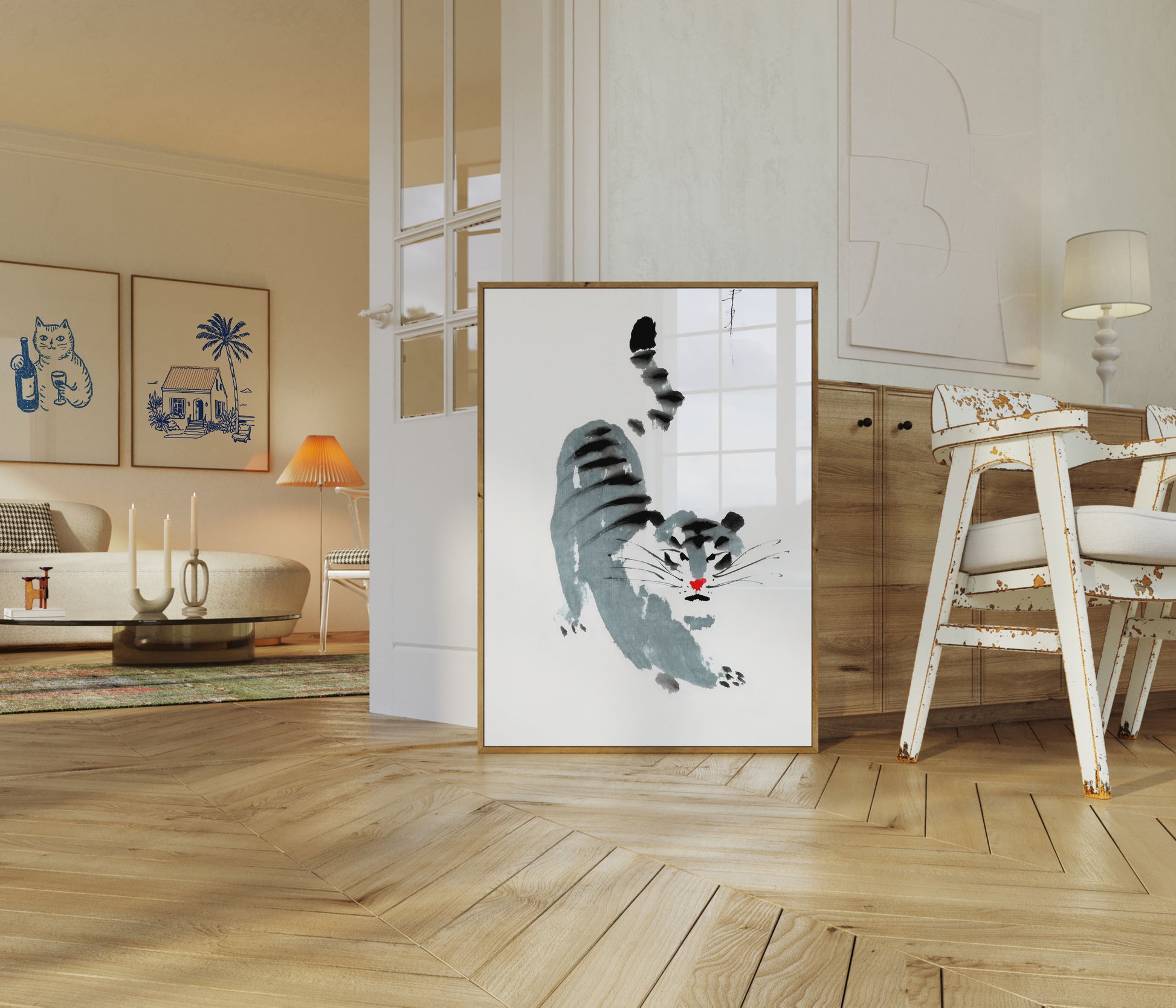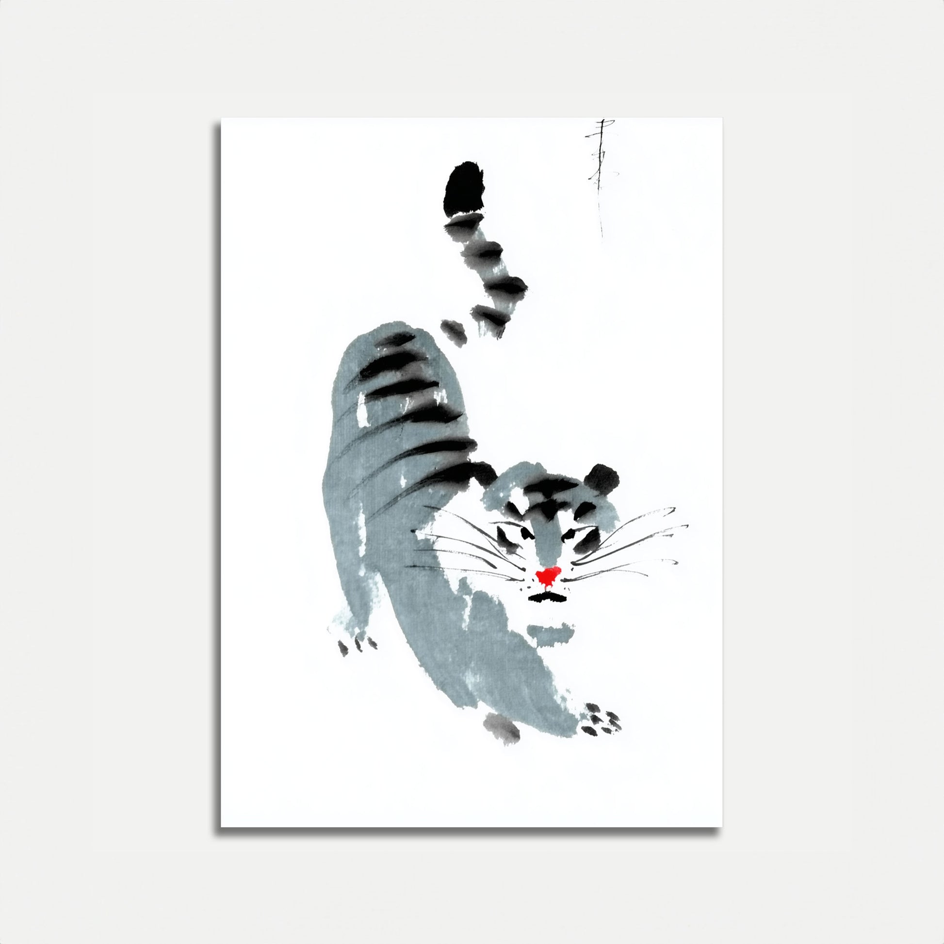 A charming ink and watercolor illustration captures a cat's whimsical essence with fluid, expressive brushstrokes. Soft gray tones blend seamlessly, creating a dynamic pose that brings the feline's personality to life. The striking red accent on the nose adds a playful pop of color to this artistic rendition.