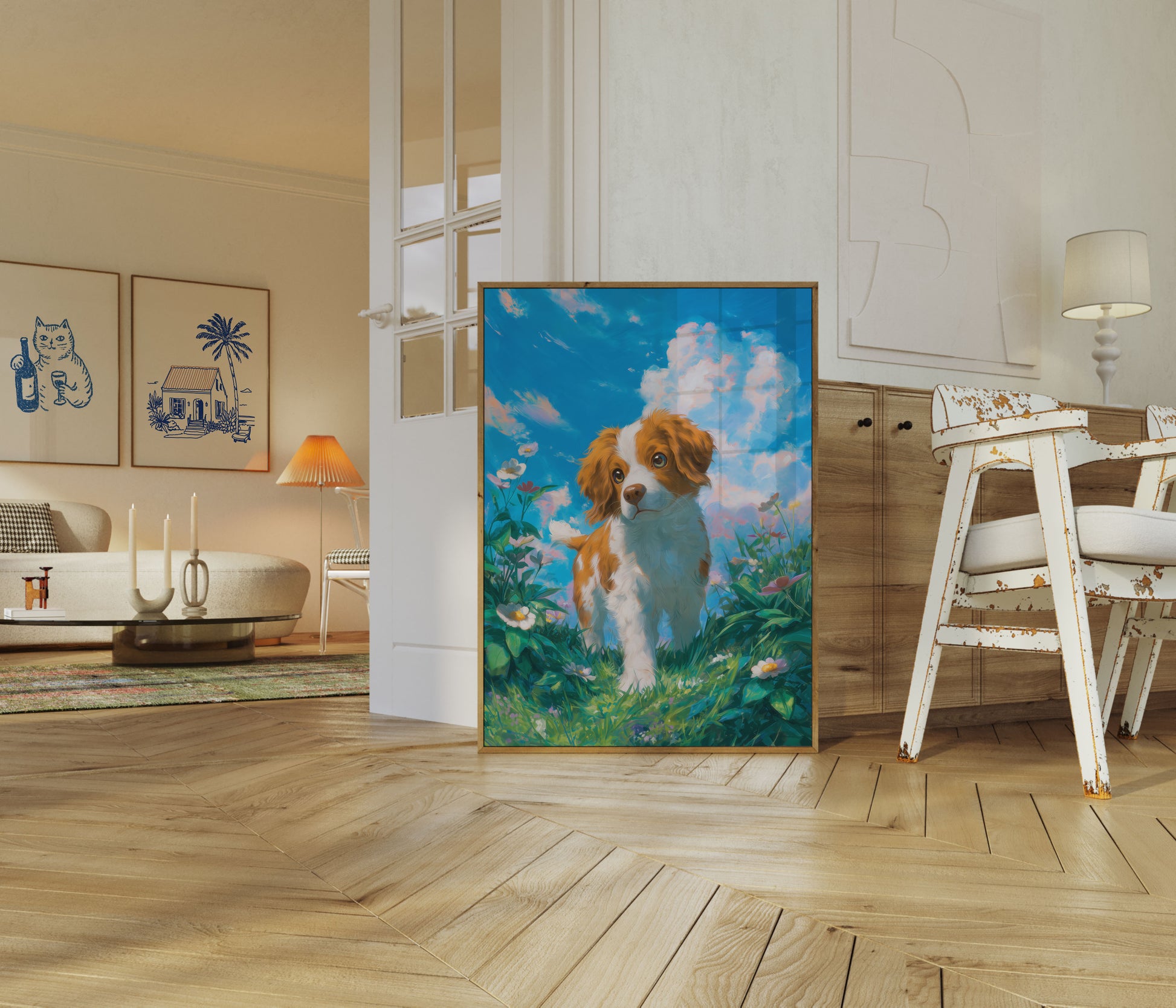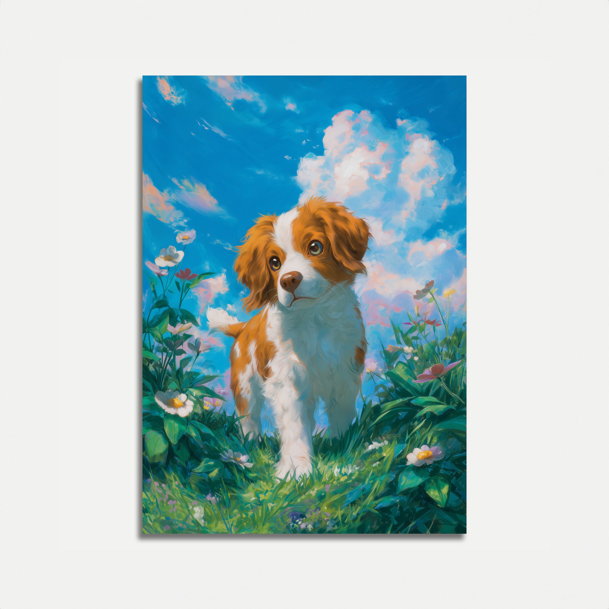 A charming painting of an adorable puppy nestled in a vibrant meadow bursting with colorful wildflowers. Soft pastel clouds drift across a brilliant blue sky, creating a dreamy backdrop for this sweet canine companion. The artwork captures the innocent joy and pure spirit of a young dog exploring a lush summer landscape.