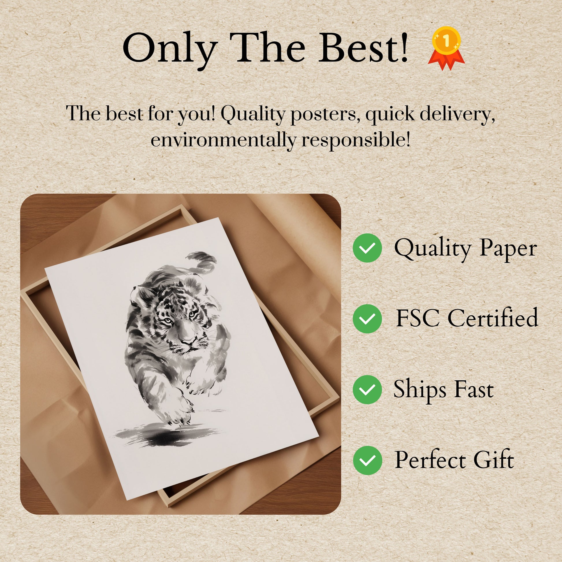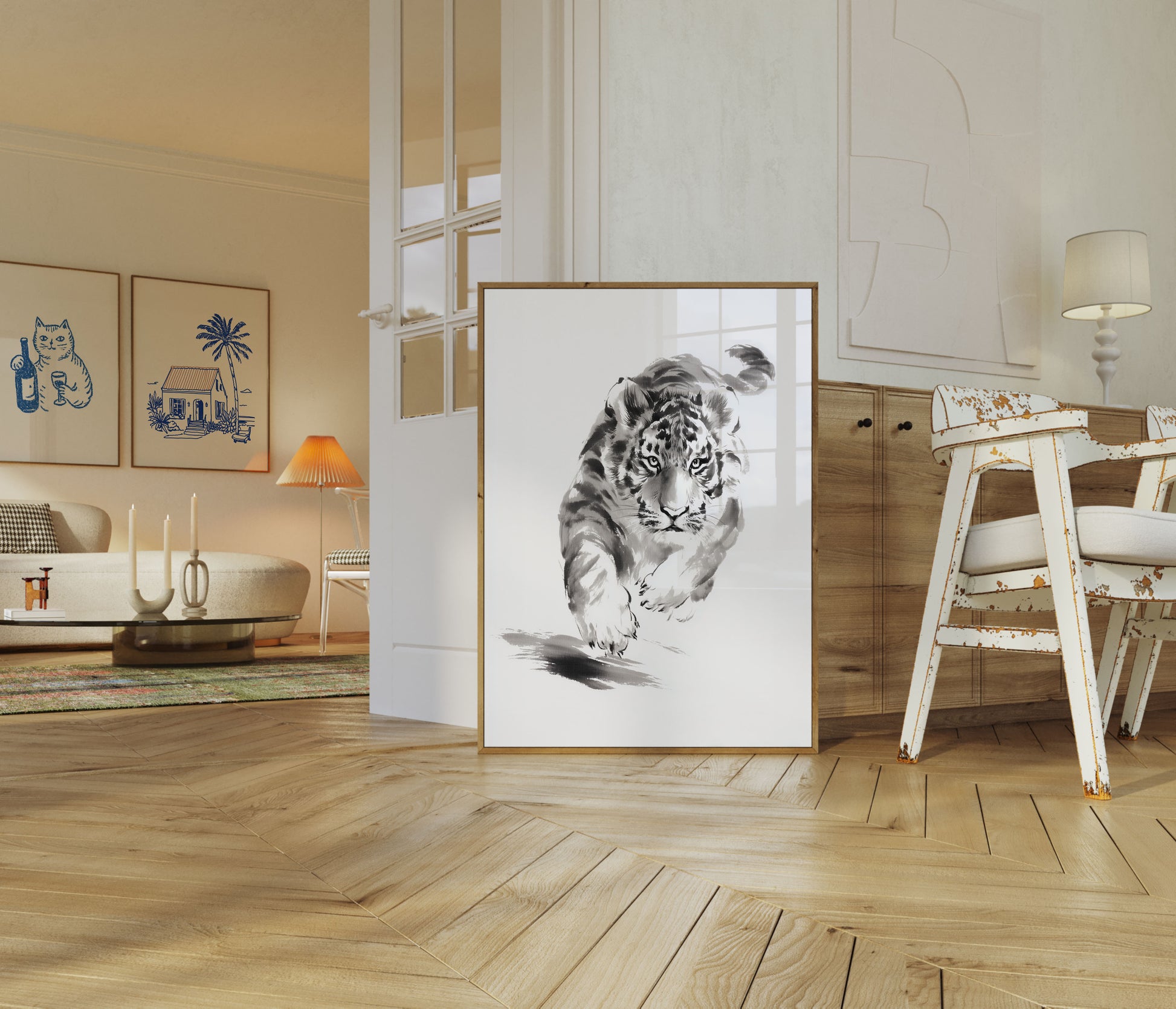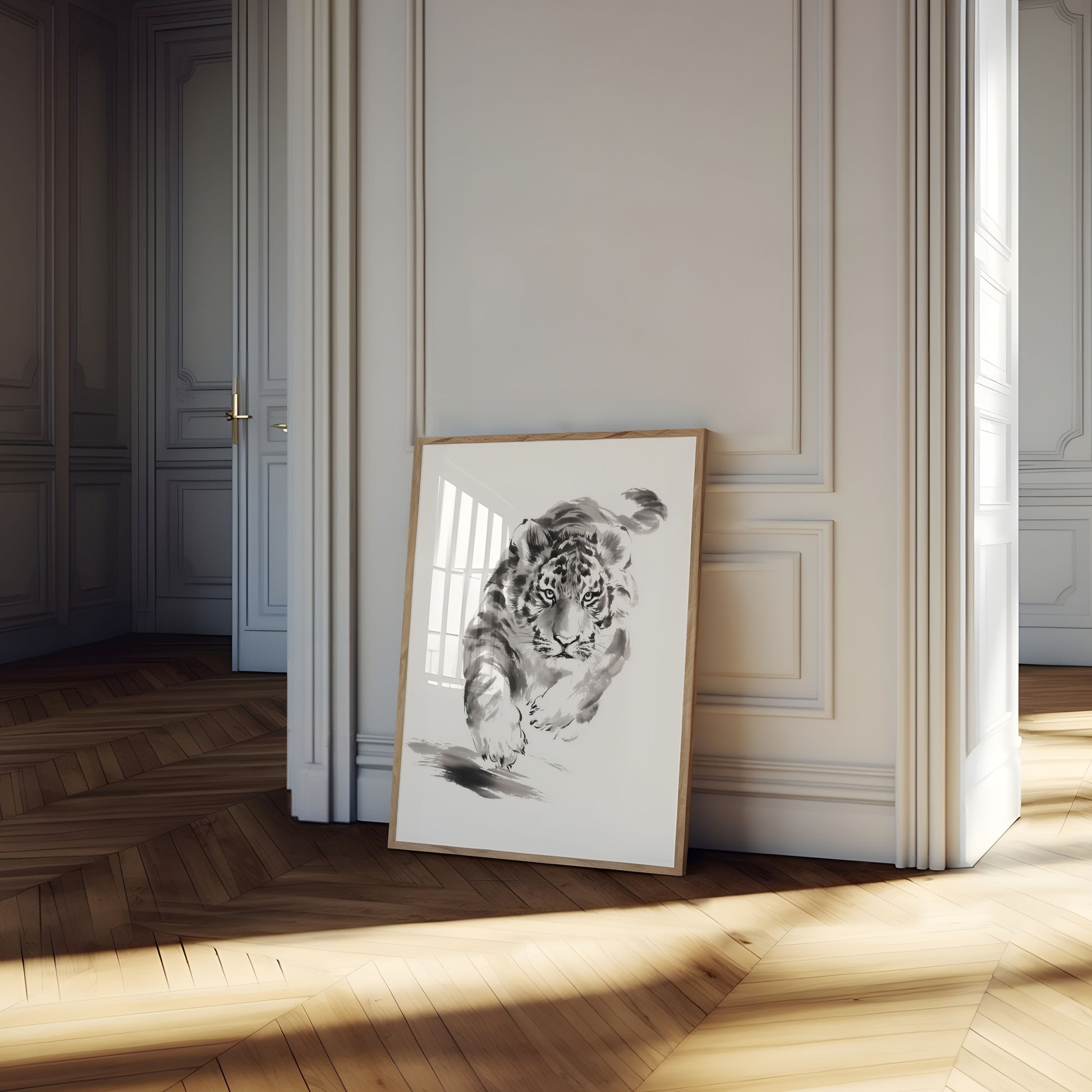 Capture the raw energy and elegance of a majestic tiger in this stunning black and white ink wash artwork. The dynamic illustration brings the big cat to life with fluid brushstrokes that convey powerful movement and intense focus, creating a mesmerizing visual experience that draws the viewer into the tiger's fierce and graceful world. Each sweeping line captures the strength and agility of this incredible predator in a breathtaking monochromatic masterpiece.