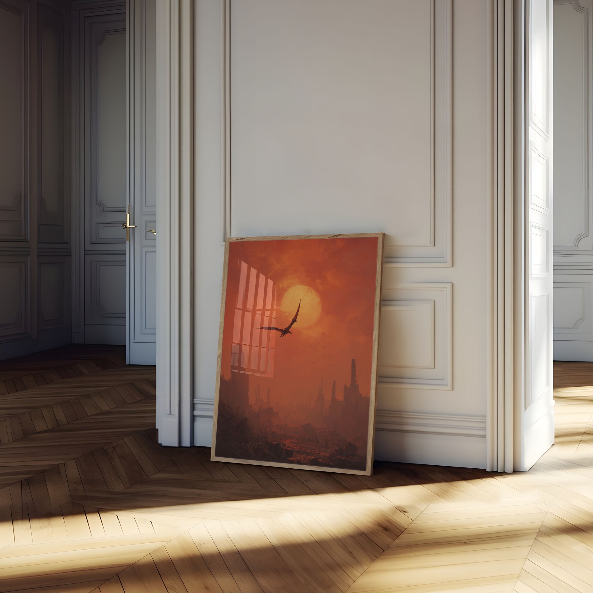 A haunting scene of a pterosaur soaring above a desolate, ruined landscape bathed in a fiery orange sunset. Towering broken structures rise like skeletal fingers against the intense crimson sky, creating a stark and dramatic vision of a world transformed. The lone flying creature symbolizes survival and resilience in an apocalyptic environment.