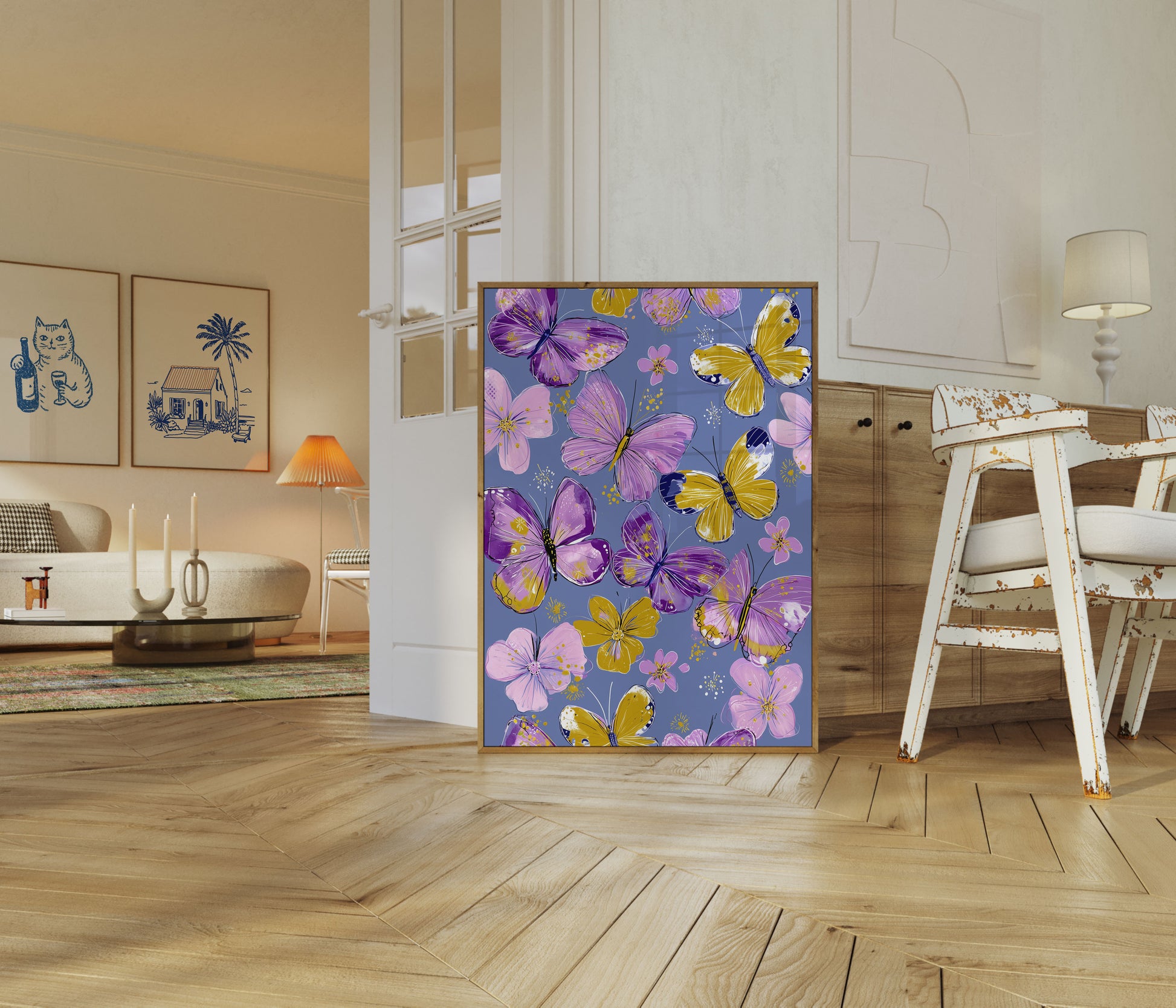 Immerse yourself in a dreamy landscape of delicate purple and golden butterflies dancing among soft pink blossoms. This stunning botanical artwork captures the ethereal beauty of nature with its vibrant color palette and intricate butterfly details. Soft blues and purples blend seamlessly, creating a serene and enchanting visual experience that will transform any room.