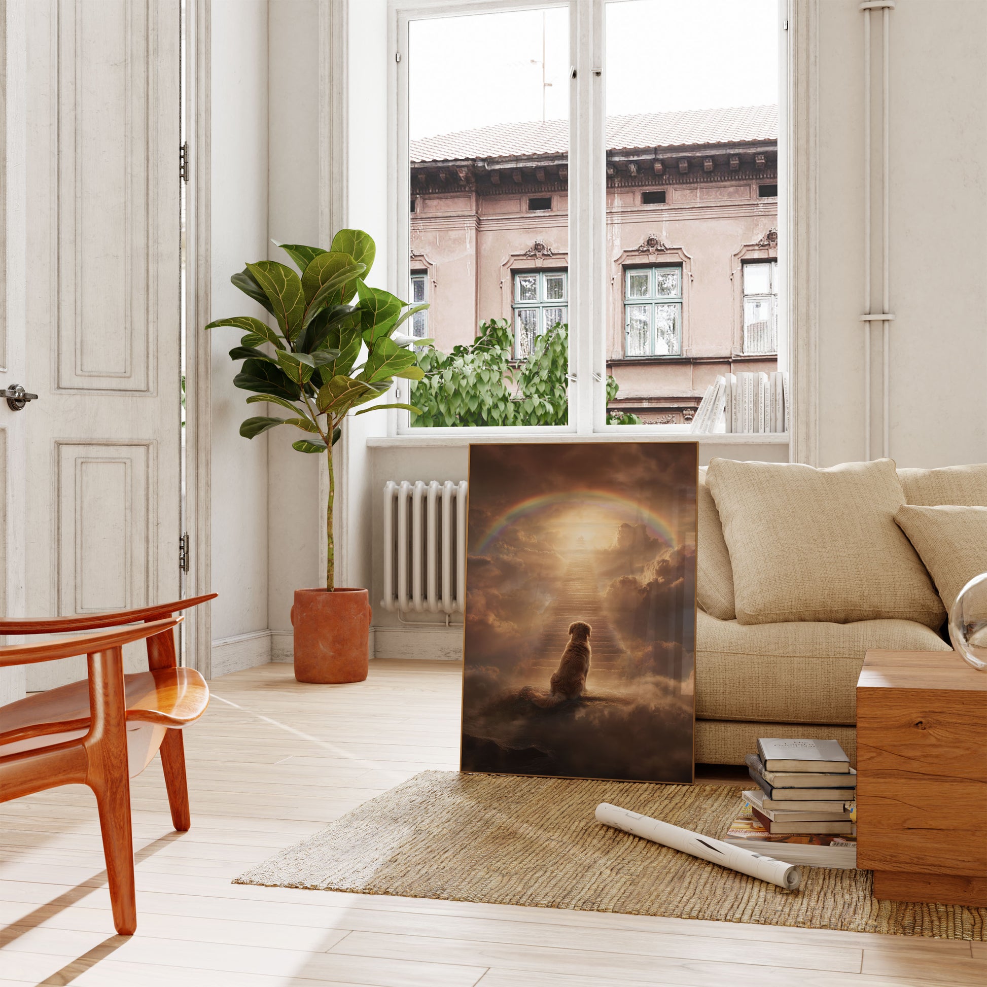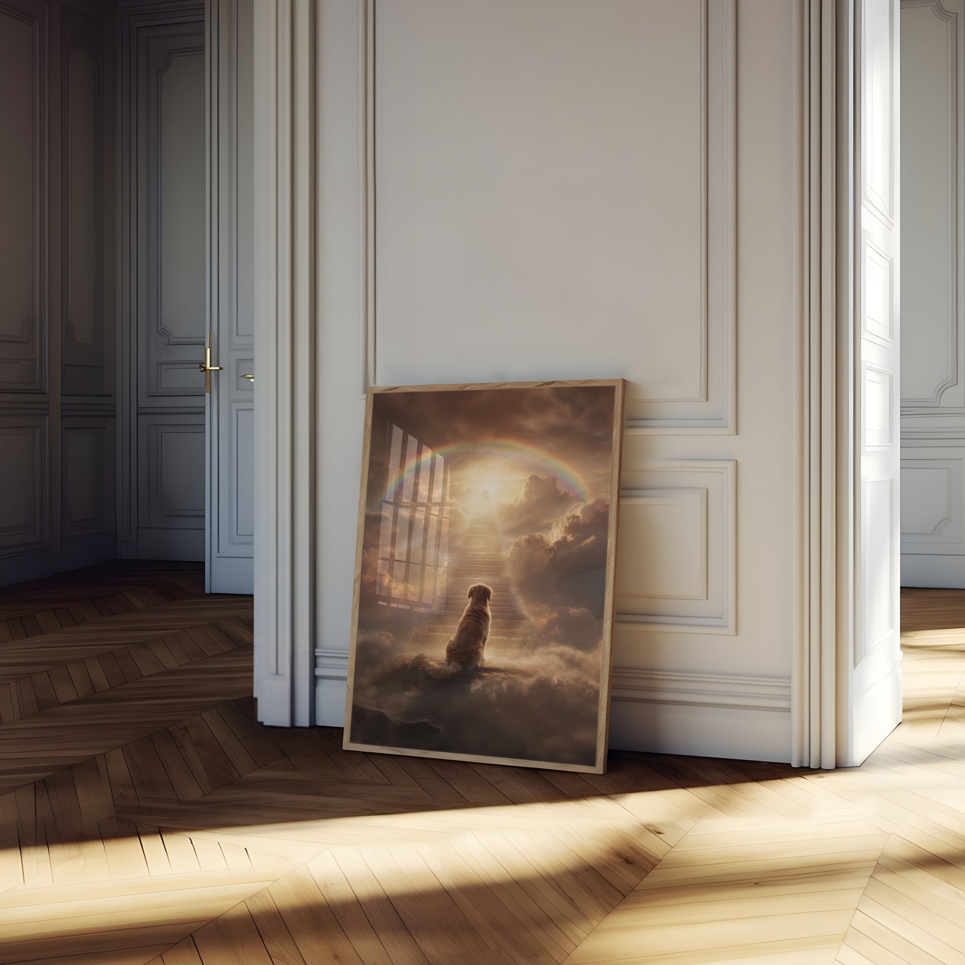 A deeply moving image captures a golden retriever sitting alone on a mystical cloud, gazing up an ethereal staircase toward a luminous rainbow and heavenly light. The serene artwork symbolizes hope, remembrance, and the eternal bond between humans and their beloved animal companions. Soft, warm clouds and a radiant spectrum create a transcendent atmosphere of peace and healing.