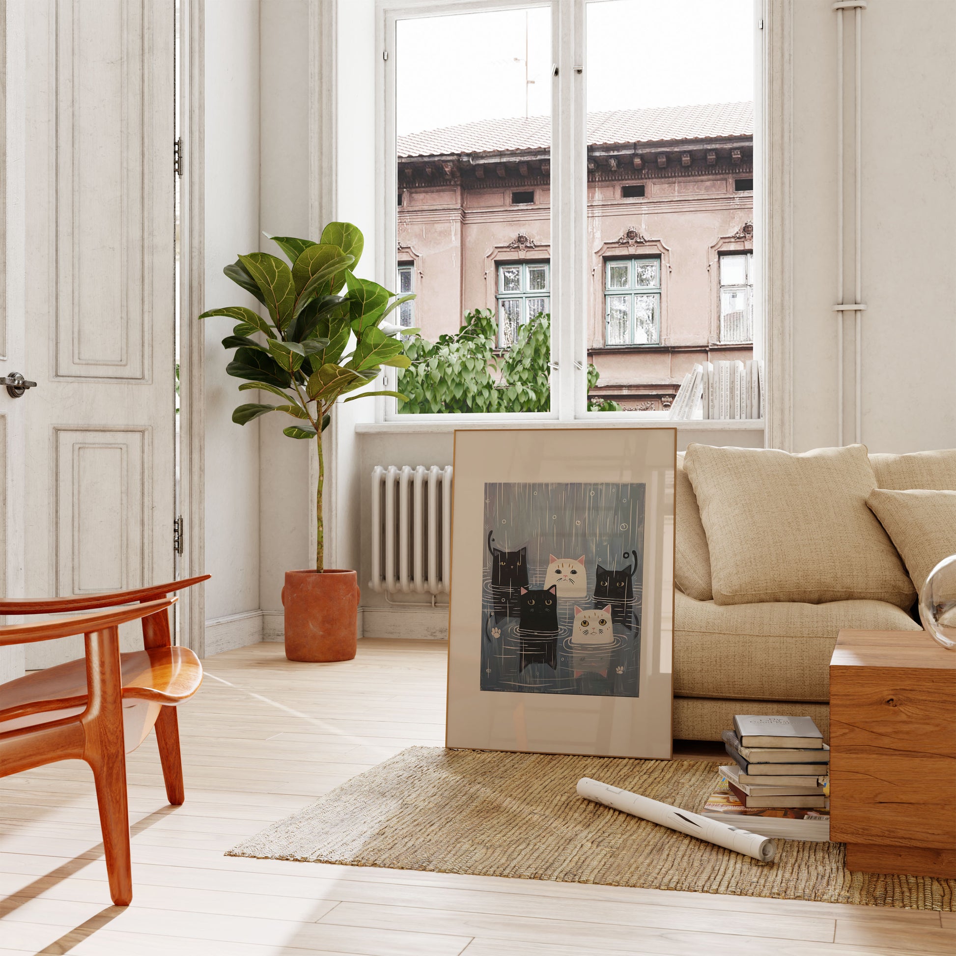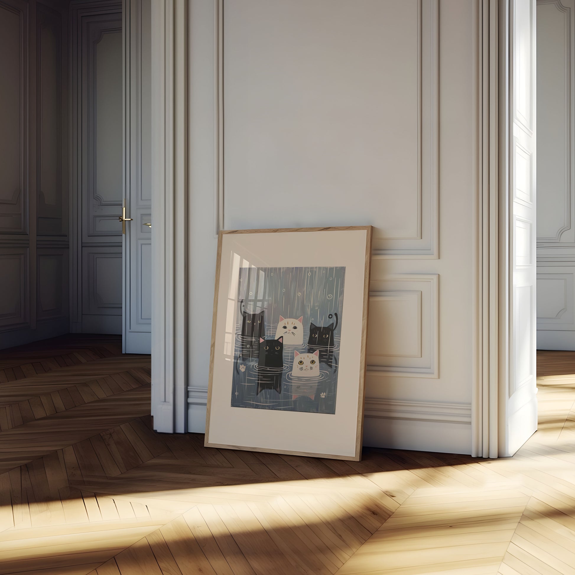 Dive into a dreamy world of adorable cats floating in a serene, rain-drenched landscape. This charming illustration captures five cats - a mix of black and white - partially submerged in swirling blue-gray waters, surrounded by soft rain lines and delicate circular droplets. The stylized cats gaze with expressive eyes, creating a whimsical and slightly melancholic atmosphere that cat lovers and art enthusiasts will absolutely adore.