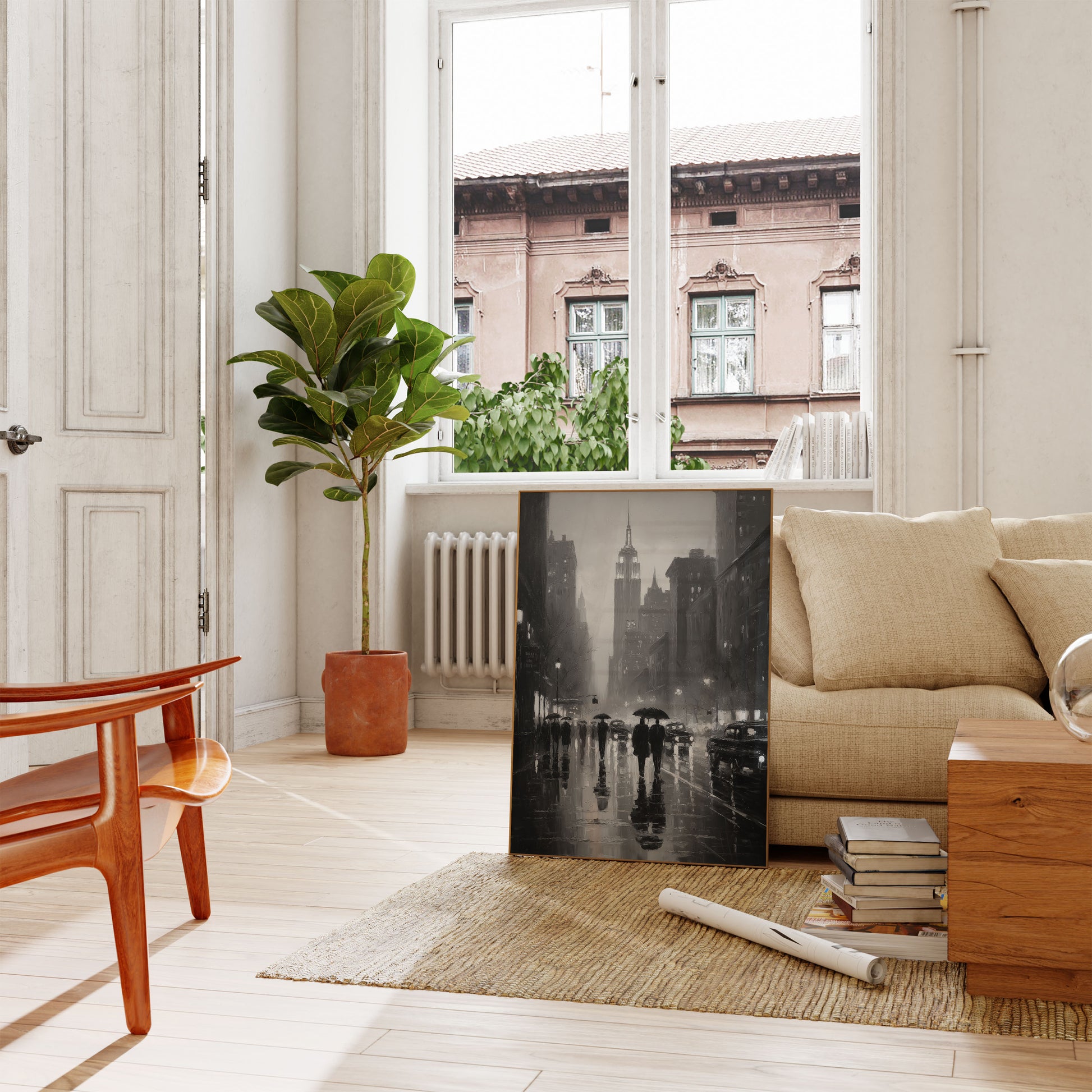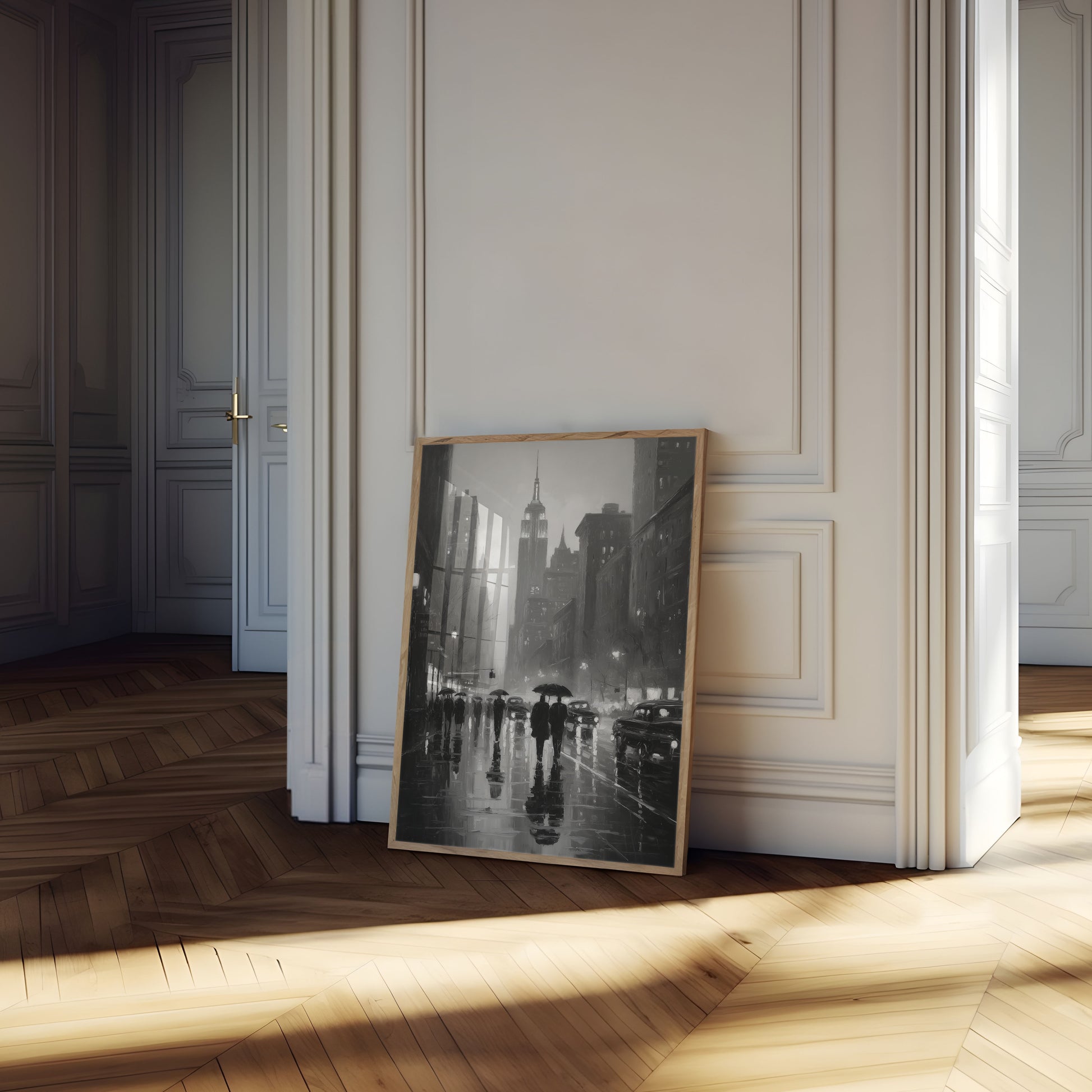 Immerse yourself in the moody atmosphere of a classic New York City rainy evening. This black and white cityscape captures the iconic Empire State Building surrounded by glistening streets, vintage cars, and silhouetted figures with umbrellas. The reflective wet pavement and soft street lights create a mesmerizing urban landscape that epitomizes the timeless charm of mid-20th century Manhattan.
