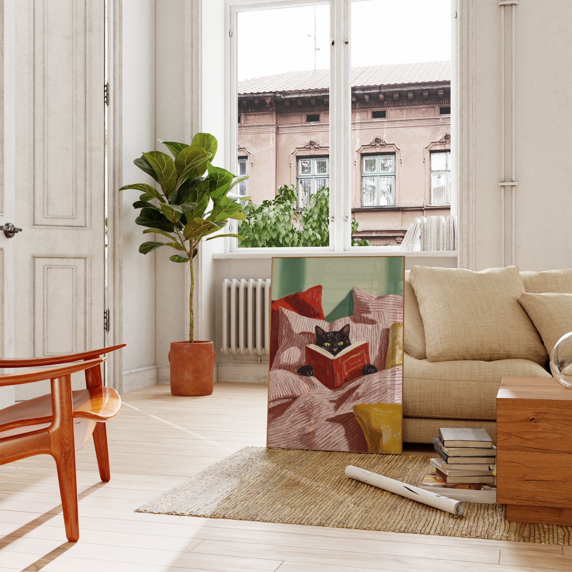 Reading Cat in Cozy Bed Poster