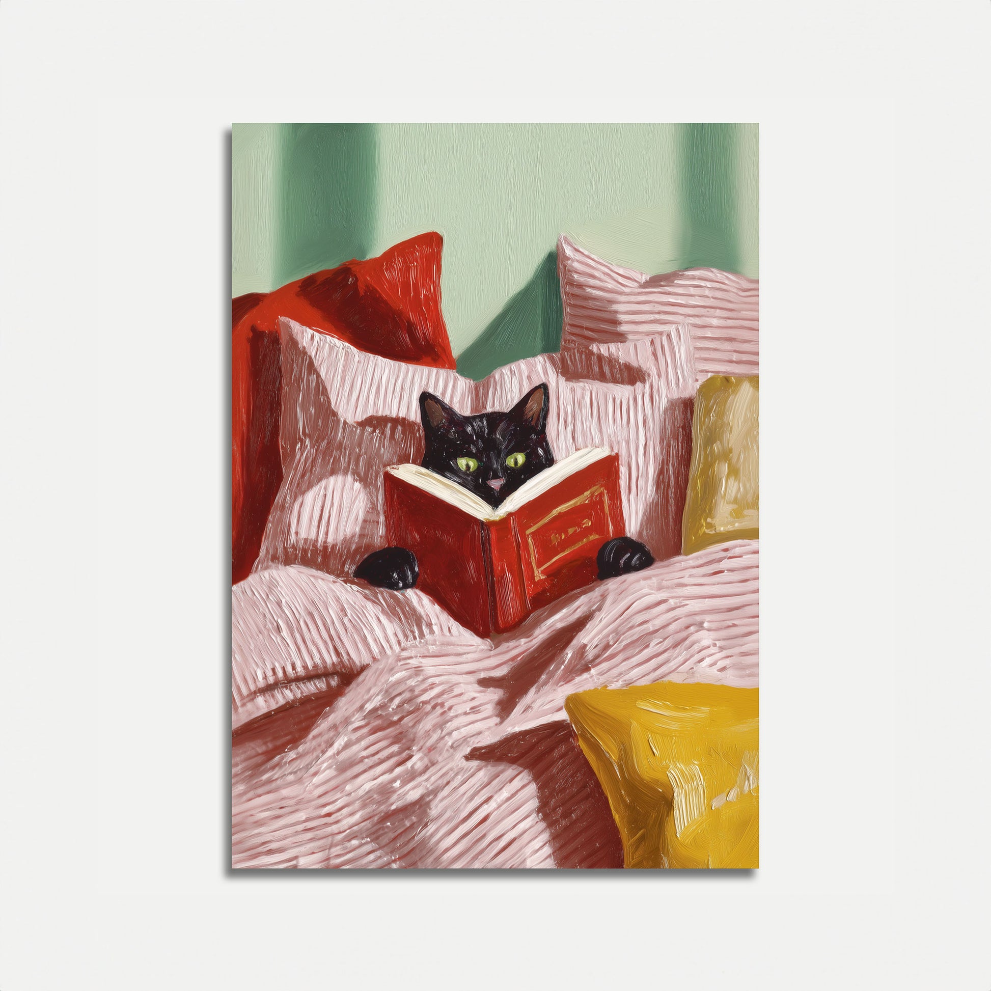 A charming black cat with luminous green eyes nestles comfortably among soft pink and red pillows, engrossed in reading a bright red book. The painting captures a delightful moment of feline tranquility, with rich, textured brushstrokes creating a warm and intimate atmosphere that invites viewers into this cozy reading scene.