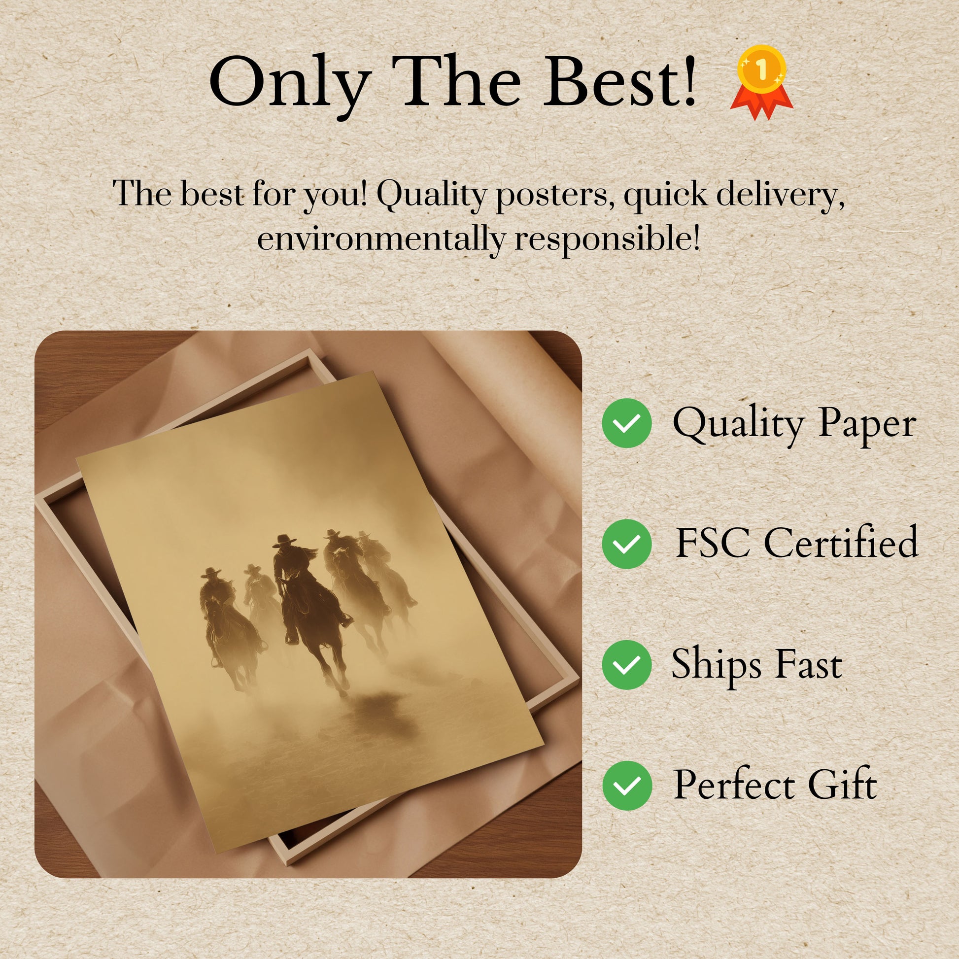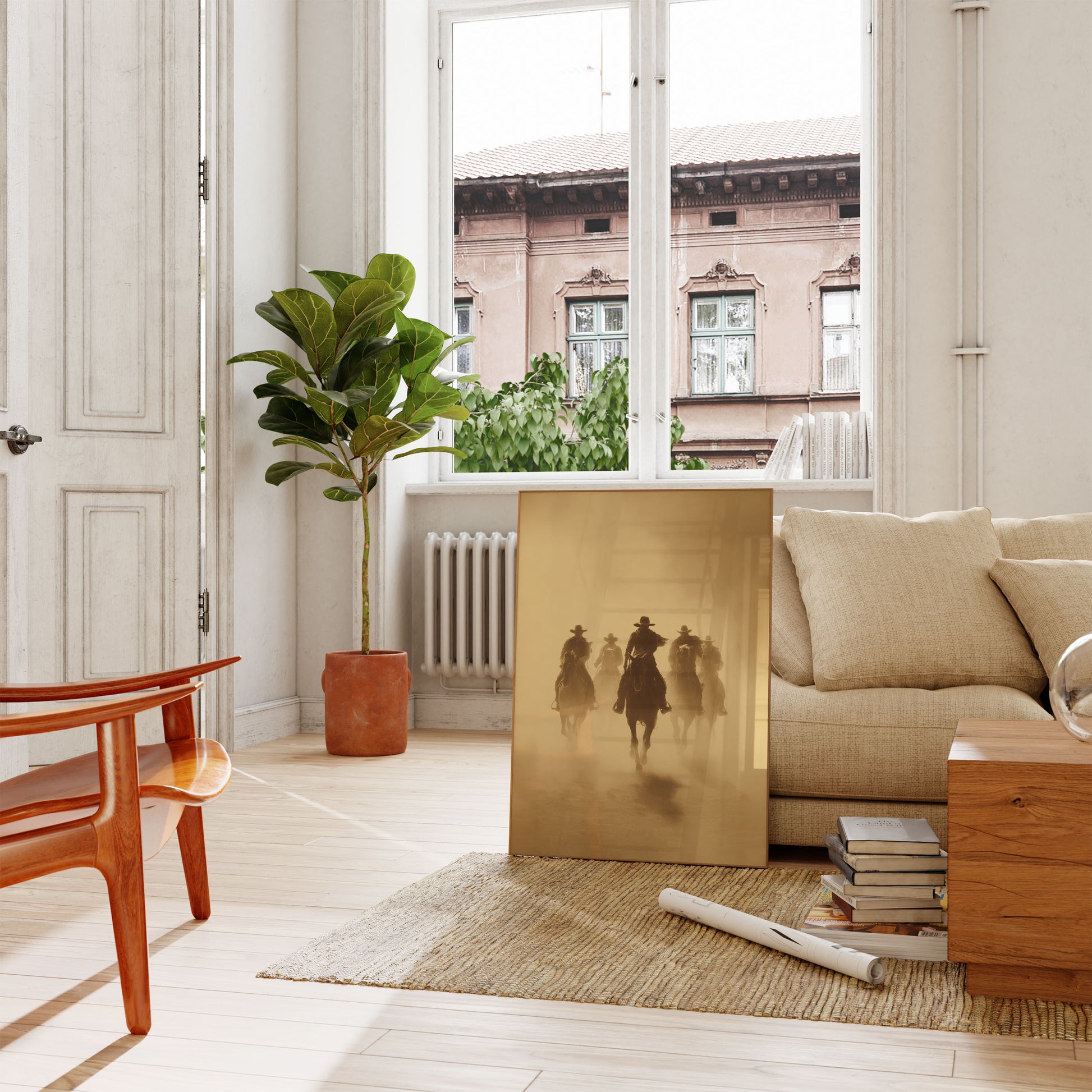 A breathtaking sepia-toned scene captures a group of cowboys riding through a golden, dust-filled landscape. The silhouetted riders emerge from the hazy background, their wide-brimmed hats and flowing coats creating a sense of mystique and adventure. Each horse and rider moves with powerful, synchronized motion, evoking the spirit of the Wild West.