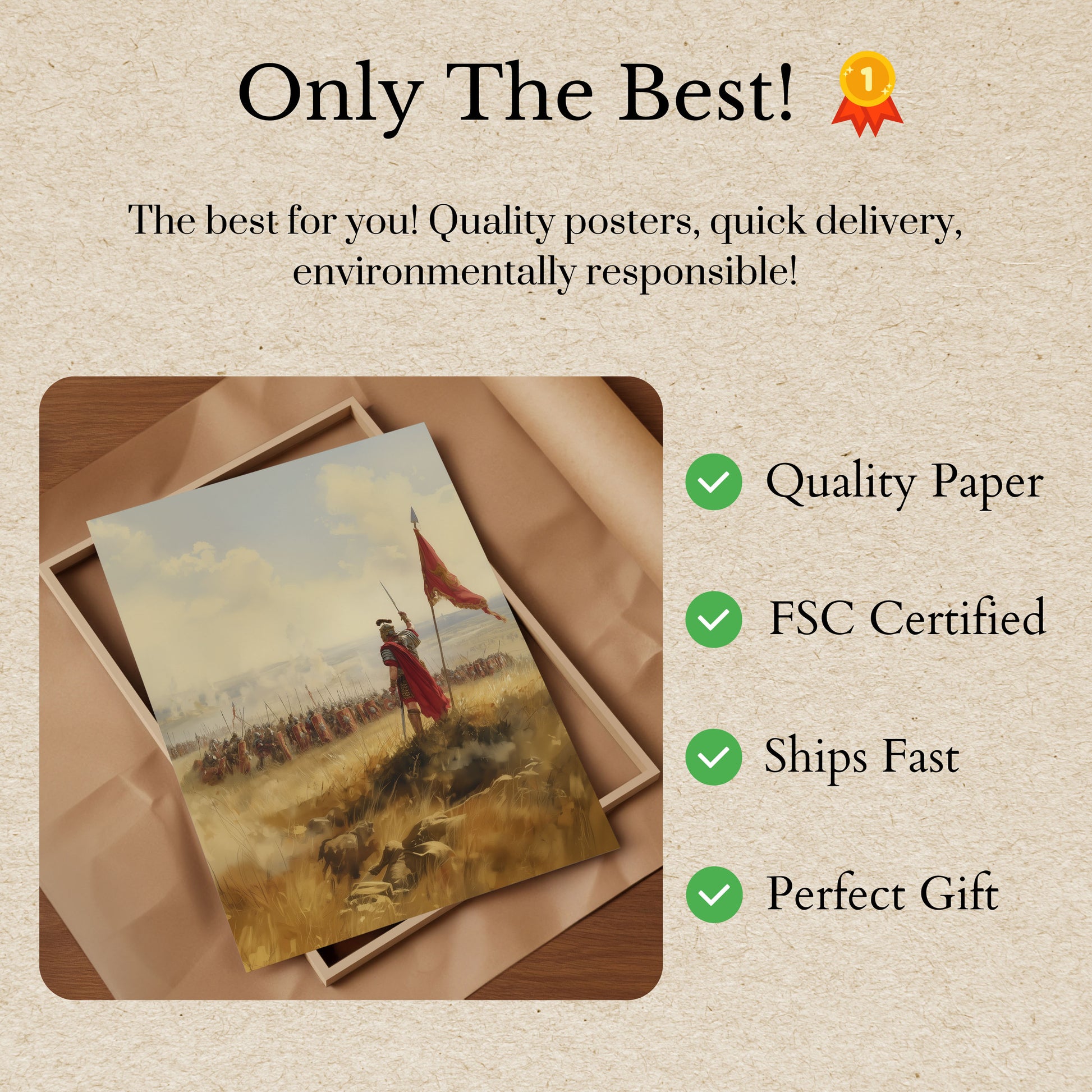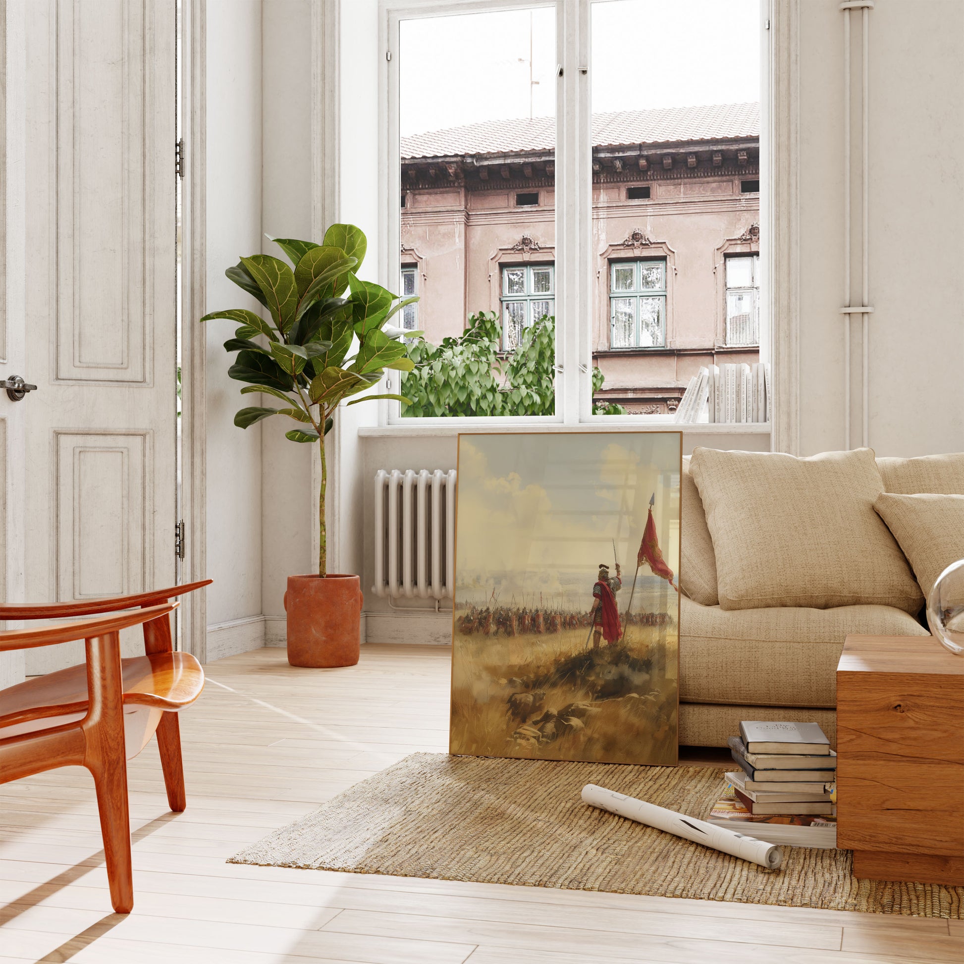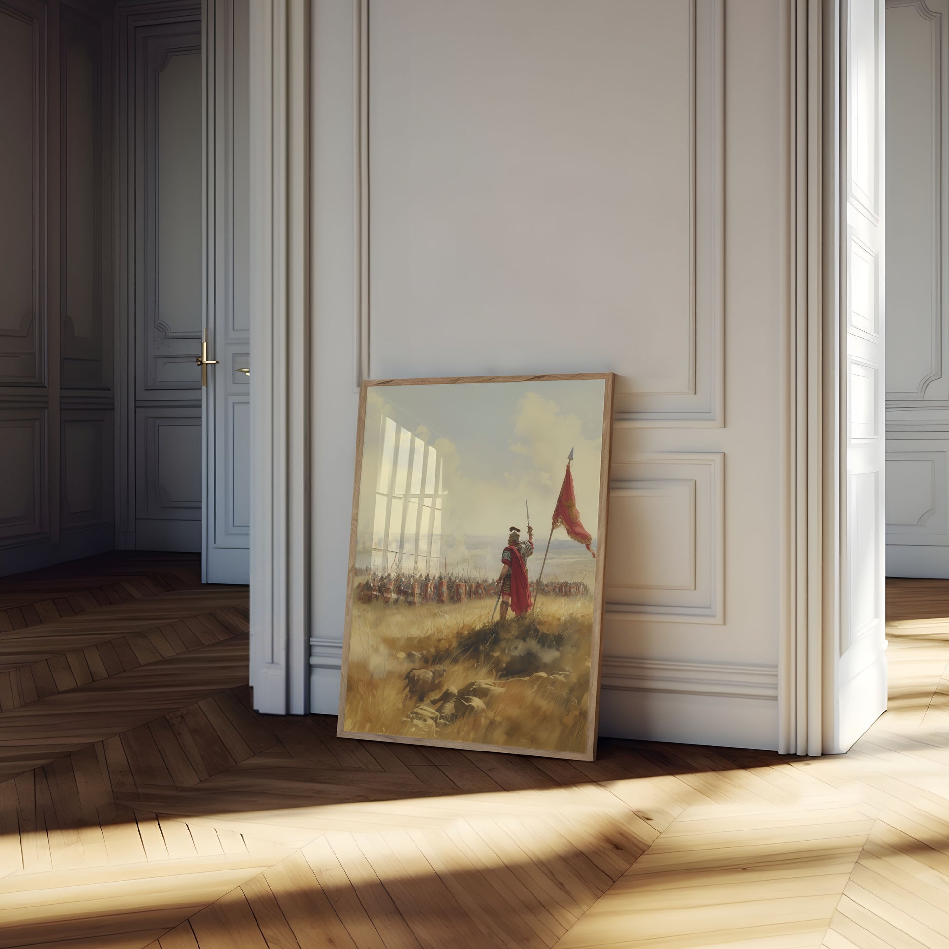 Experience the epic drama of ancient warfare with this stunning illustration of a Roman legionary standing tall on a golden field, commanding his troops beneath a billowing red standard. The artwork captures the raw intensity of Roman military might, with rows of disciplined soldiers stretching across a misty battlefield, their shields gleaming and spears raised. Soft, warm tones of wheat-colored grass and hazy sky create a dramatic backdrop that highlights the strength and resolve of these legendary warriors.
