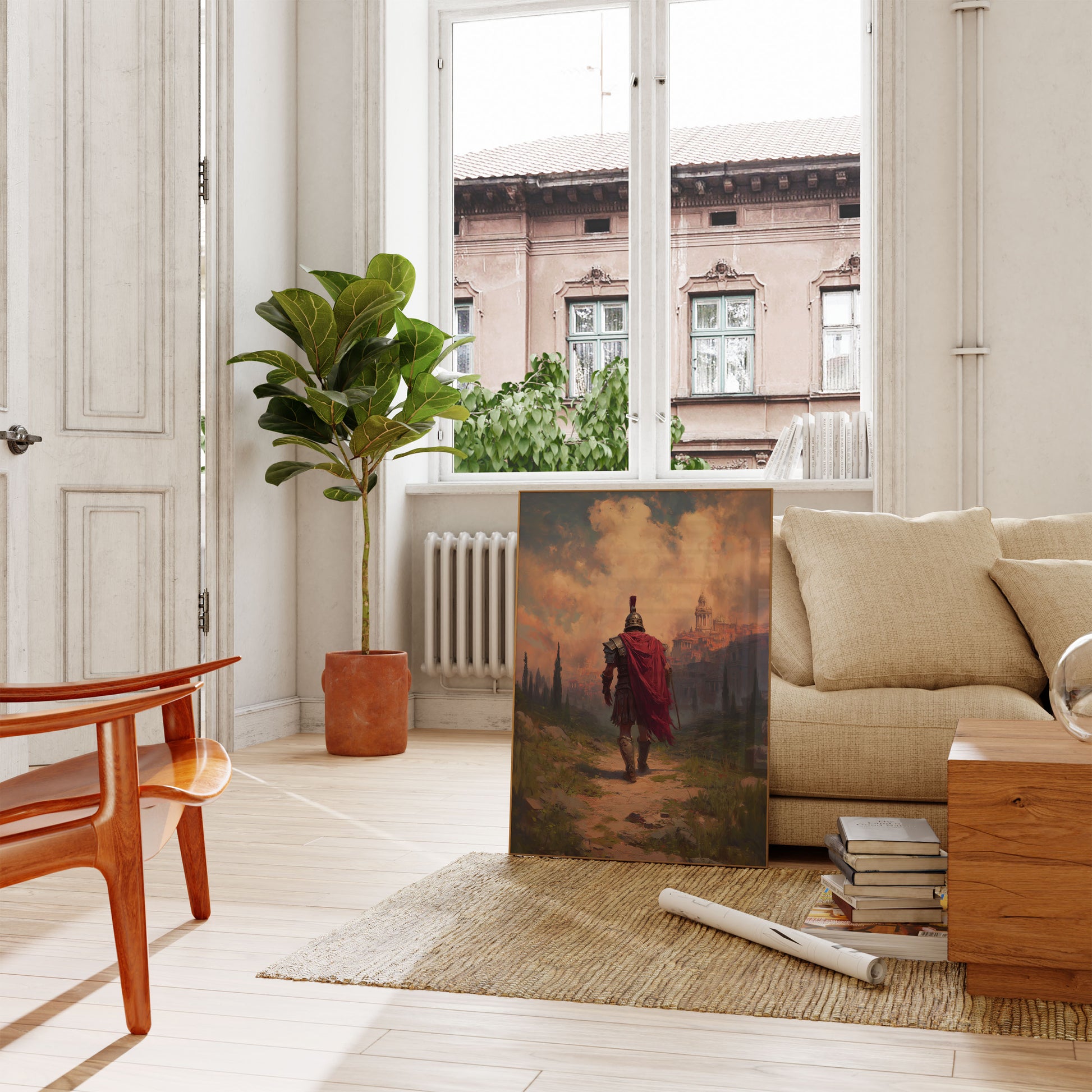 Step into the breathtaking world of an ancient Roman warrior surveying a majestic city bathed in golden sunset light. This stunning artwork captures a lone soldier from behind, his crimson cape billowing dramatically against a landscape of cypress trees and monumental architecture. The painting evokes a sense of heroic solitude and timeless adventure, with luminous clouds and a warmly rendered cityscape creating an atmosphere of epic historical grandeur.