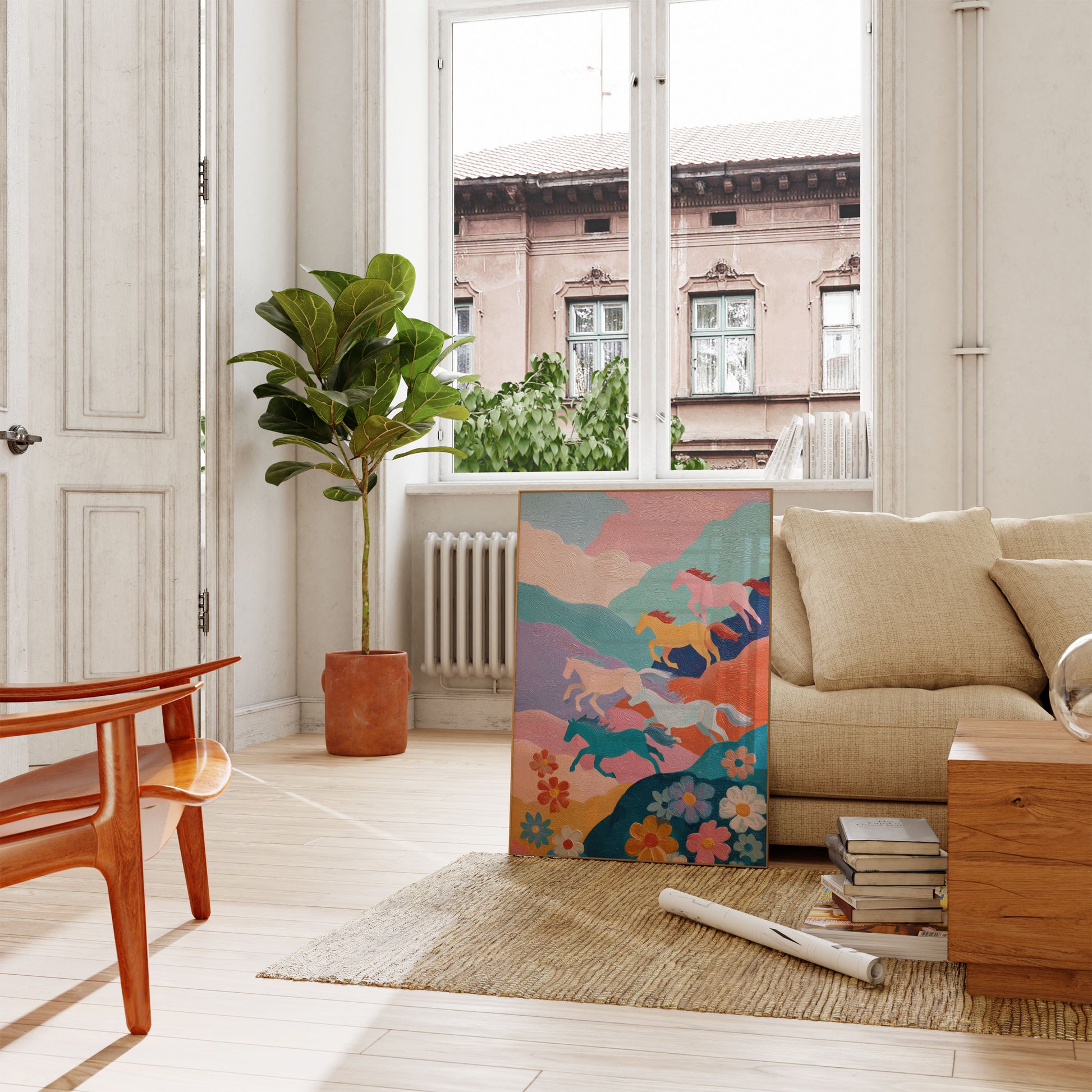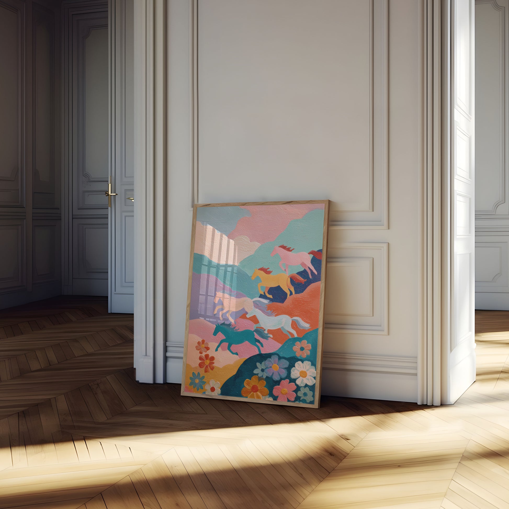 Dive into a dreamlike landscape where colorful horses gallop across a vibrant, undulating terrain. Soft pastel hues of pink, blue, yellow, and teal create a mesmerizing backdrop, while playful flowers bloom in the foreground, adding a touch of whimsy to this dynamic scene. The fluid brushstrokes and imaginative color palette bring a sense of movement and freedom to this captivating artwork.