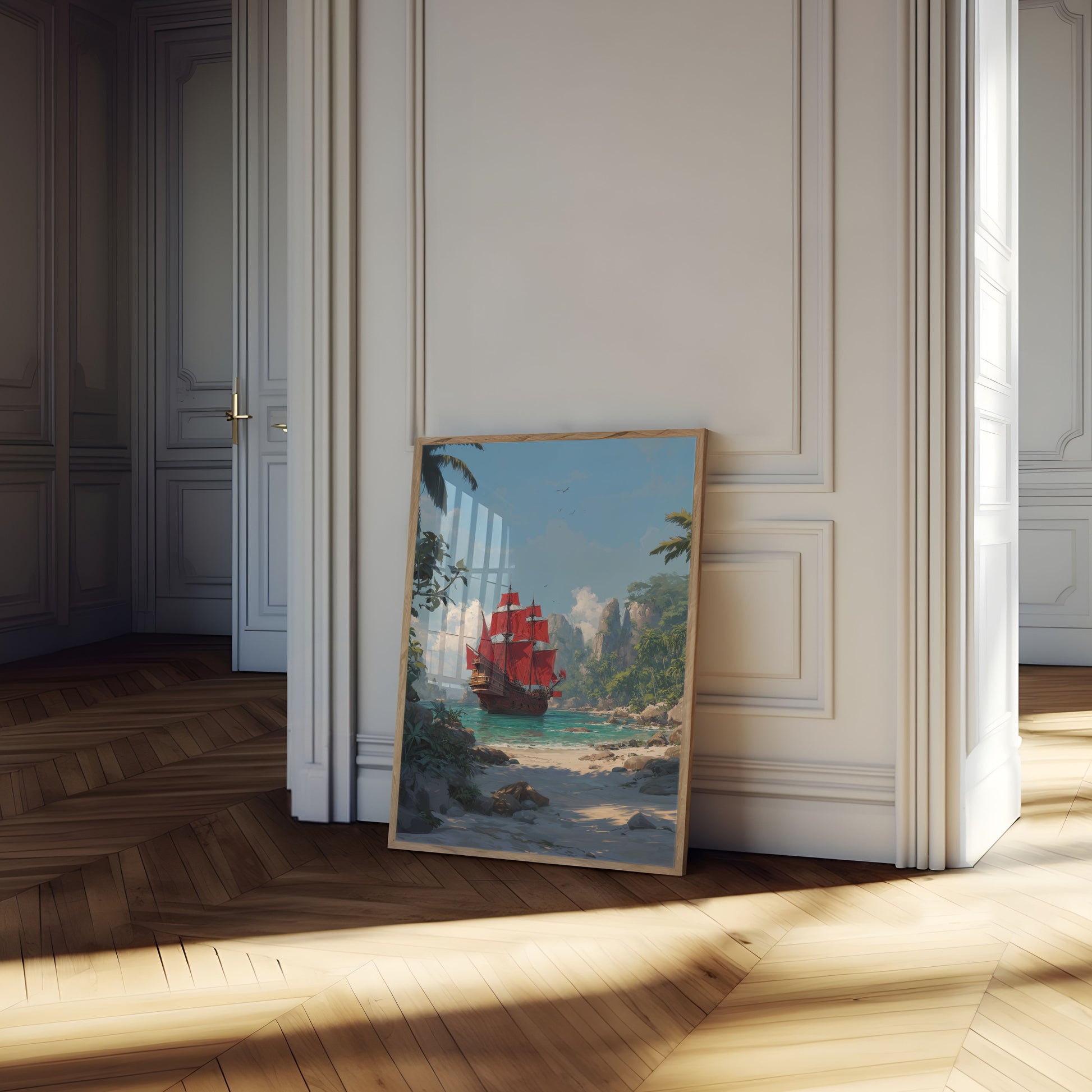 Immerse yourself in a breathtaking maritime scene where a magnificent red-sailed ship anchors near a lush tropical coastline. Vibrant crimson sails billow against a serene turquoise sea, framed by dramatic rocky cliffs and verdant palm trees. This stunning artwork captures the essence of adventure, mystery, and the untamed beauty of an unexplored paradise.