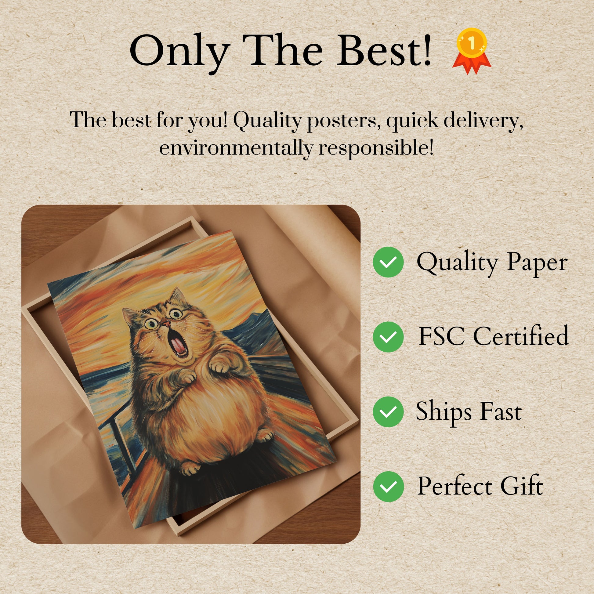 A hilarious and haunting parody of Edvard Munch's famous 'The Scream', this poster reimagines the iconic existential painting with a startled, wide-eyed orange tabby cat. Set against a swirling sunset landscape of oranges and blues, the plump feline sits in pure shock, mouth agape, capturing a moment of pure comedic existential dread. This surreal art piece transforms a classic masterpiece into a delightfully absurd feline adventure that will spark conversation and laughter in any room.
