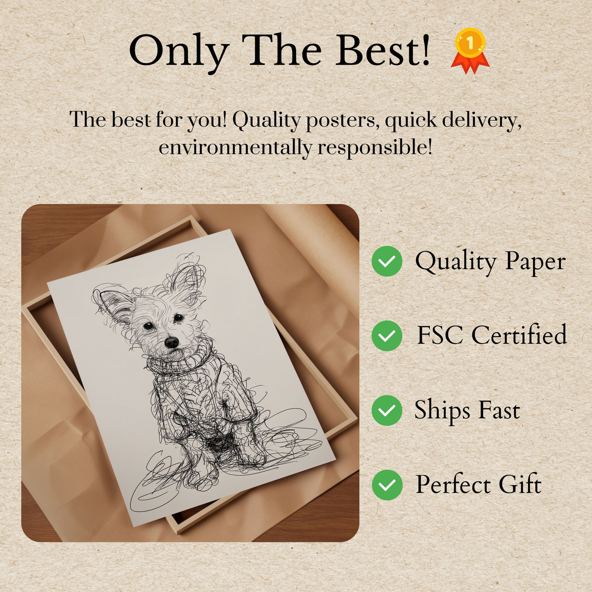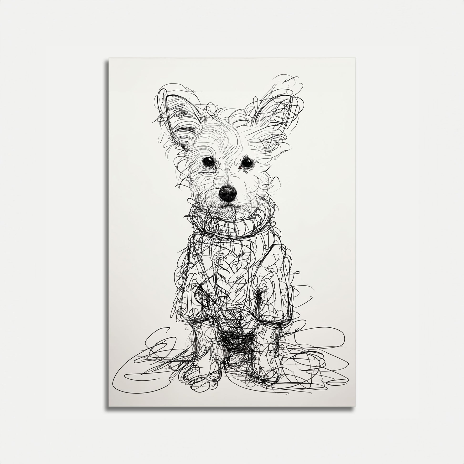 A charming and unique sketch captures the adorable essence of a small dog, rendered in a mesmerizing tangle of fluid black lines. The intricate drawing transforms the cute canine into a living, breathing work of art, with delicate line work revealing expressive eyes and a soft, fluffy coat. Each swirling stroke brings depth and movement to this endearing portrait.