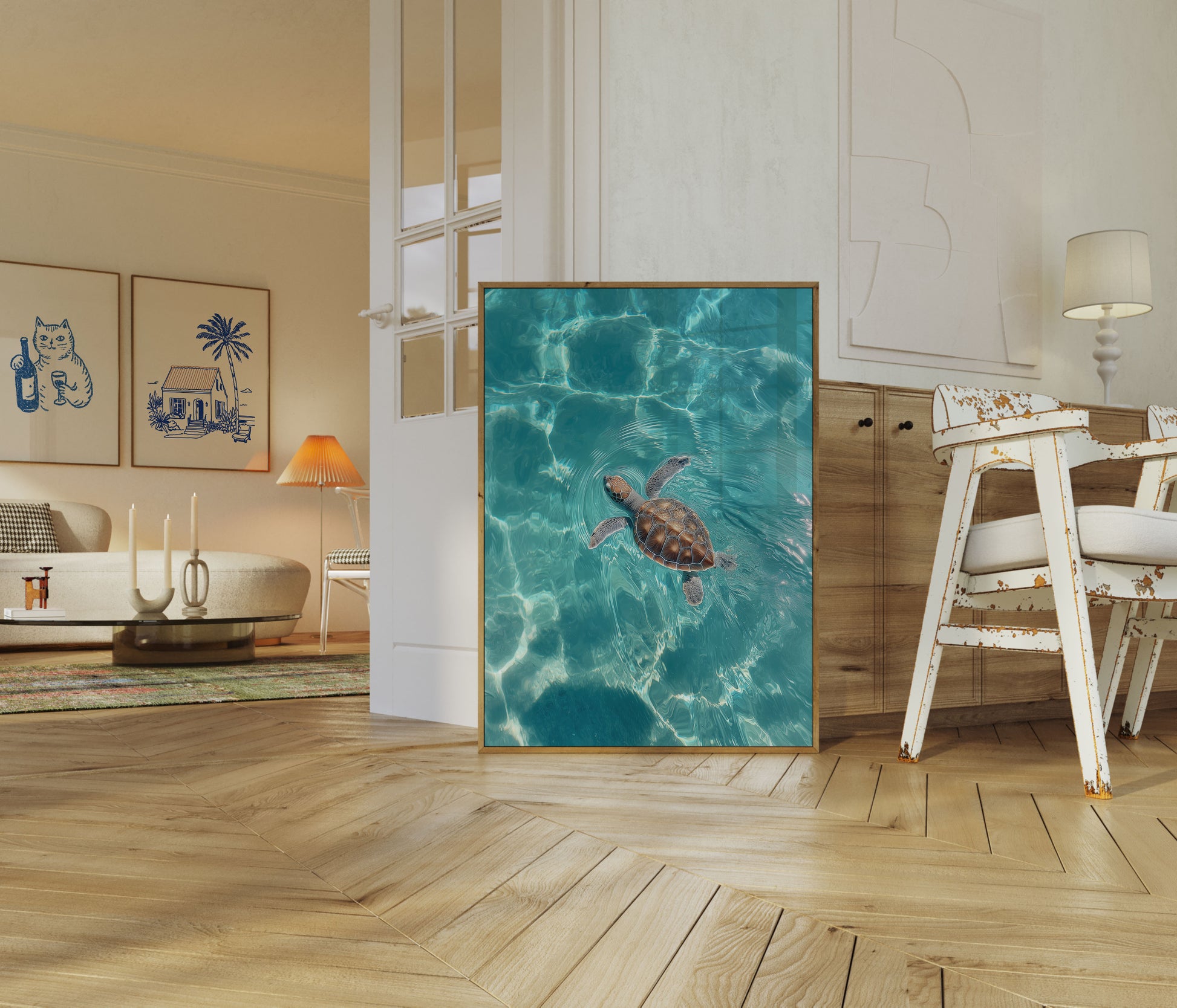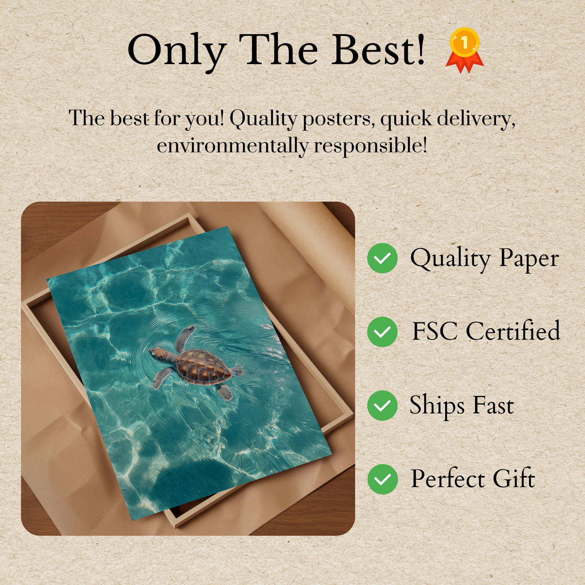 Dive into the mesmerizing world of marine beauty with this stunning sea turtle poster. Captured in crystal-clear turquoise waters, the turtle glides gracefully, its intricate shell patterns creating a breathtaking display of nature's artistry. The image's ethereal light and water reflections transform this marine scene into a captivating underwater masterpiece.