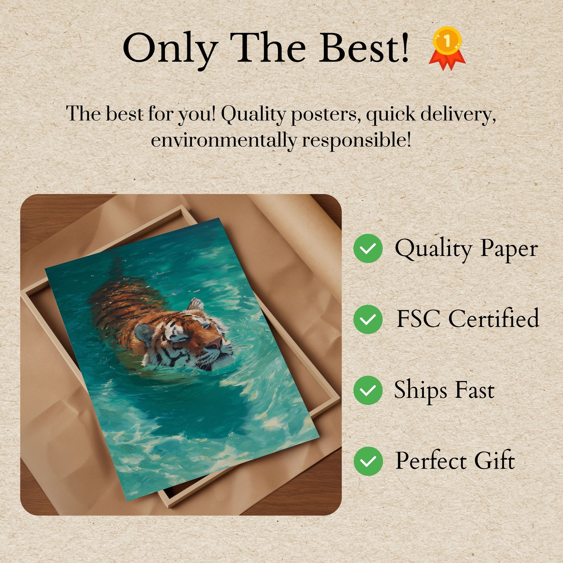 Dive into the tranquil world of a majestic tiger gliding through crystal-clear turquoise waters. This stunning art piece captures the rare and mesmerizing moment of a tiger at complete peace, with closed eyes and a seamless blend of orange-striped fur against the vibrant aquamarine backdrop. The artwork invites viewers into a dreamlike scene of unexpected calm and natural beauty.