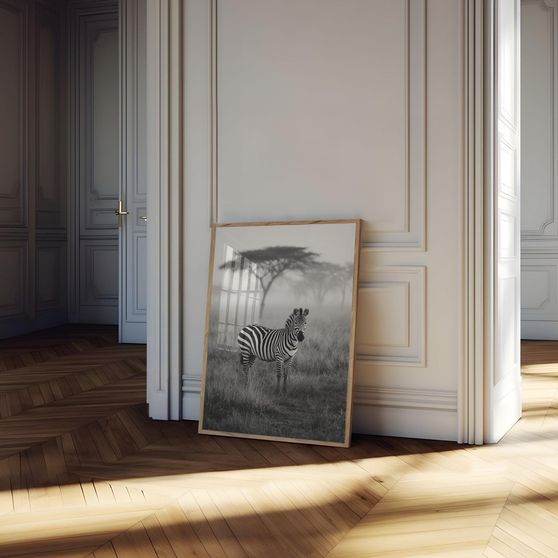 Discover the breathtaking beauty of the African wilderness with this stunning black and white photograph featuring a solitary zebra standing amid misty grasslands. The iconic acacia tree silhouetted in the background creates a dreamlike atmosphere, capturing the raw essence of the savanna landscape. This monochromatic masterpiece brings the timeless elegance of wildlife photography directly into your living space.