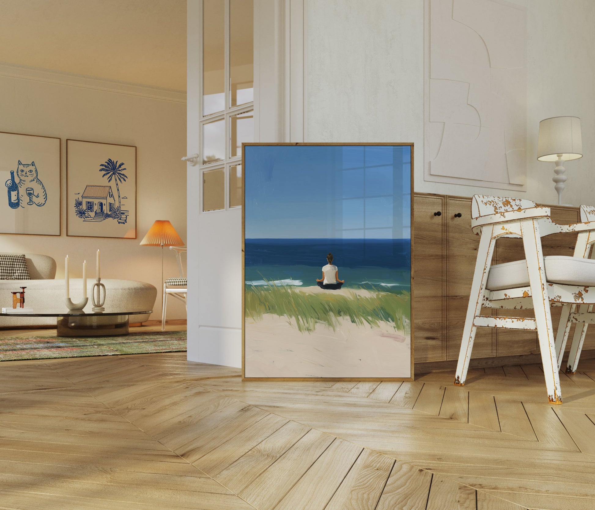 A tranquil scene of meditation overlooking the ocean, capturing a moment of pure calm and inner peace. The artwork depicts a figure seated in a lotus position on a sandy beach, surrounded by gentle beach grass, with the vast blue sea and sky stretching endlessly before them. Soft, calming brushstrokes create a sense of stillness and contemplation.