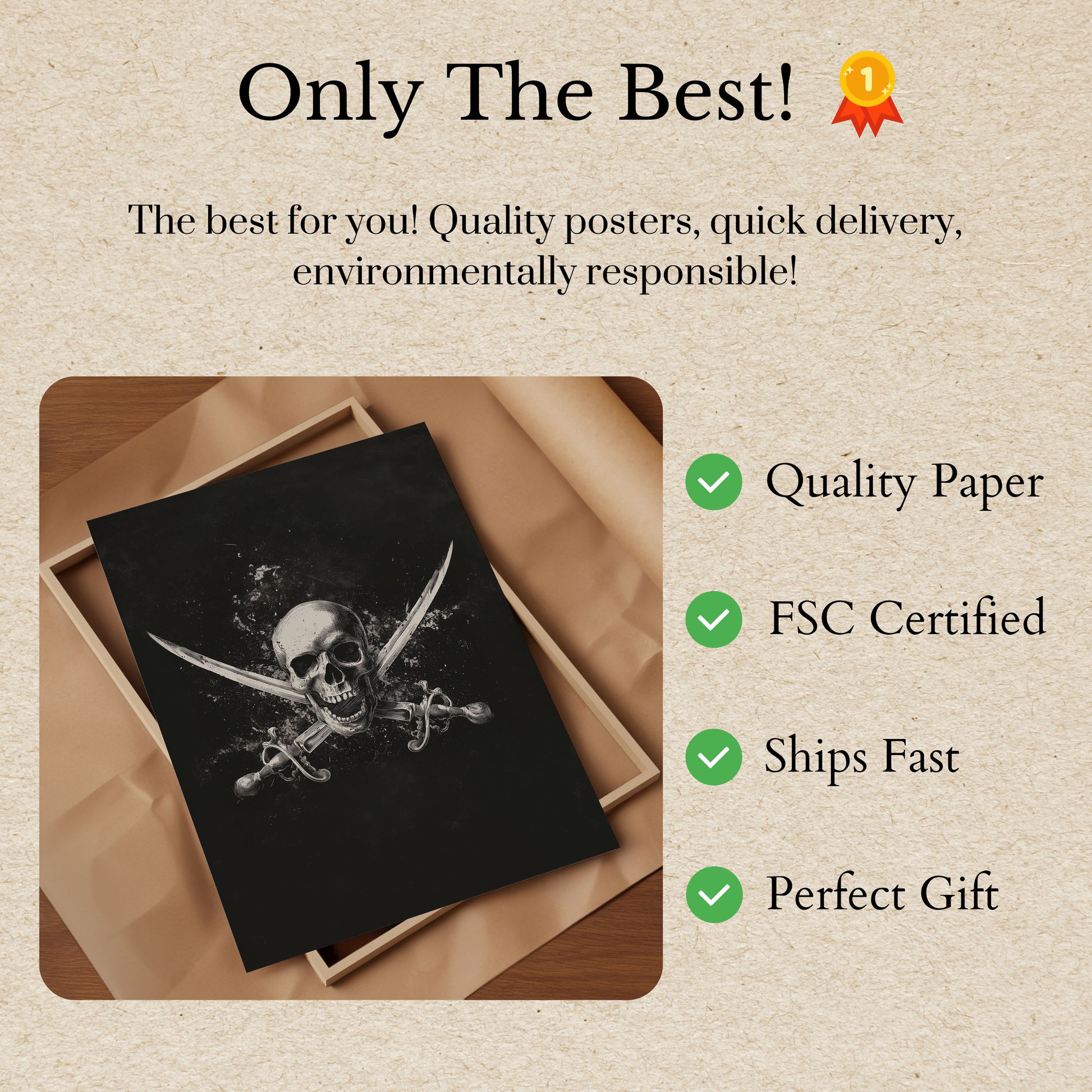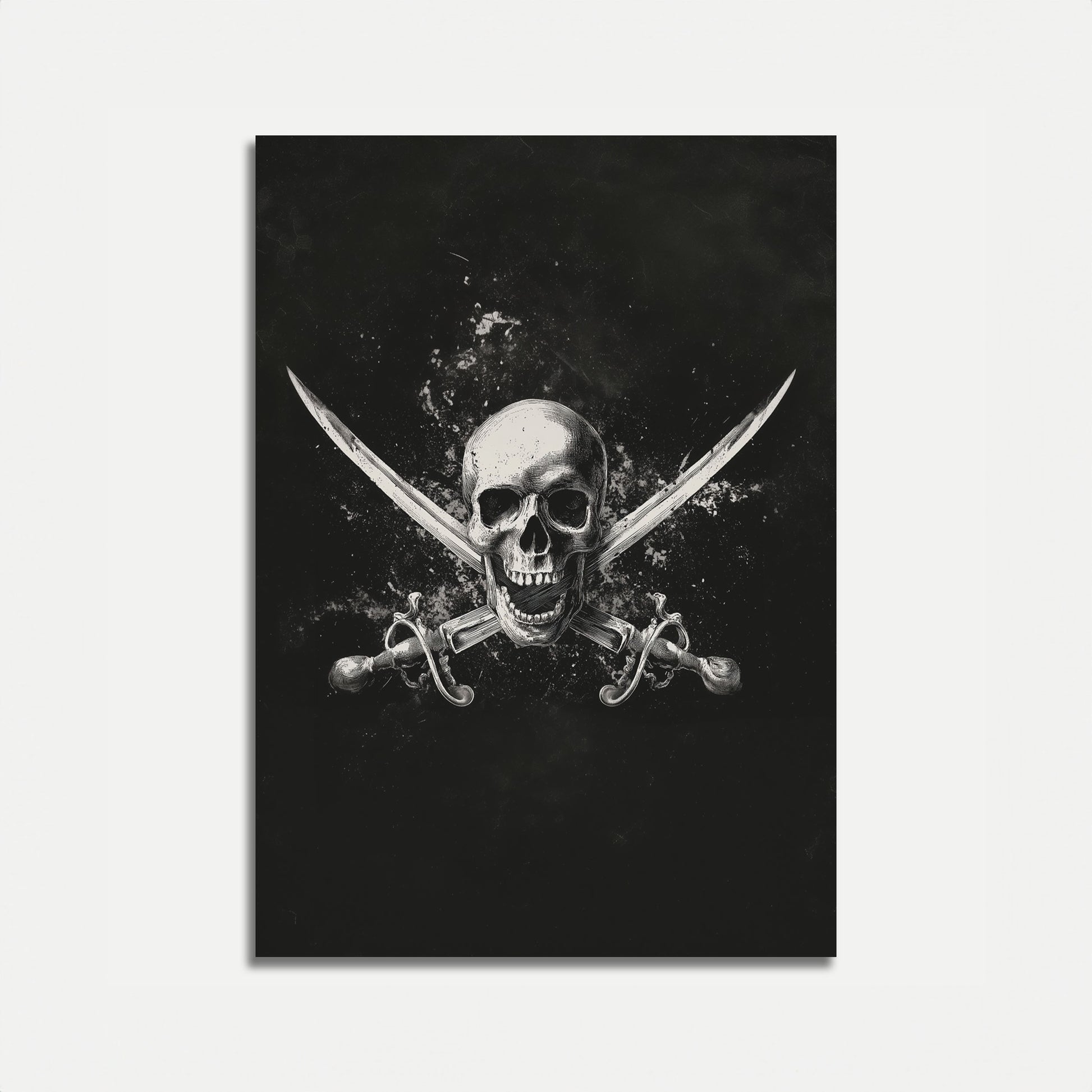 A striking black and white illustration depicting a menacing skull with two sharp crossed swords, set against a dark, gritty background. The detailed etching-style artwork captures the rebellious spirit of pirate iconography, with intricate line work and dramatic shading that creates a powerful visual impact.