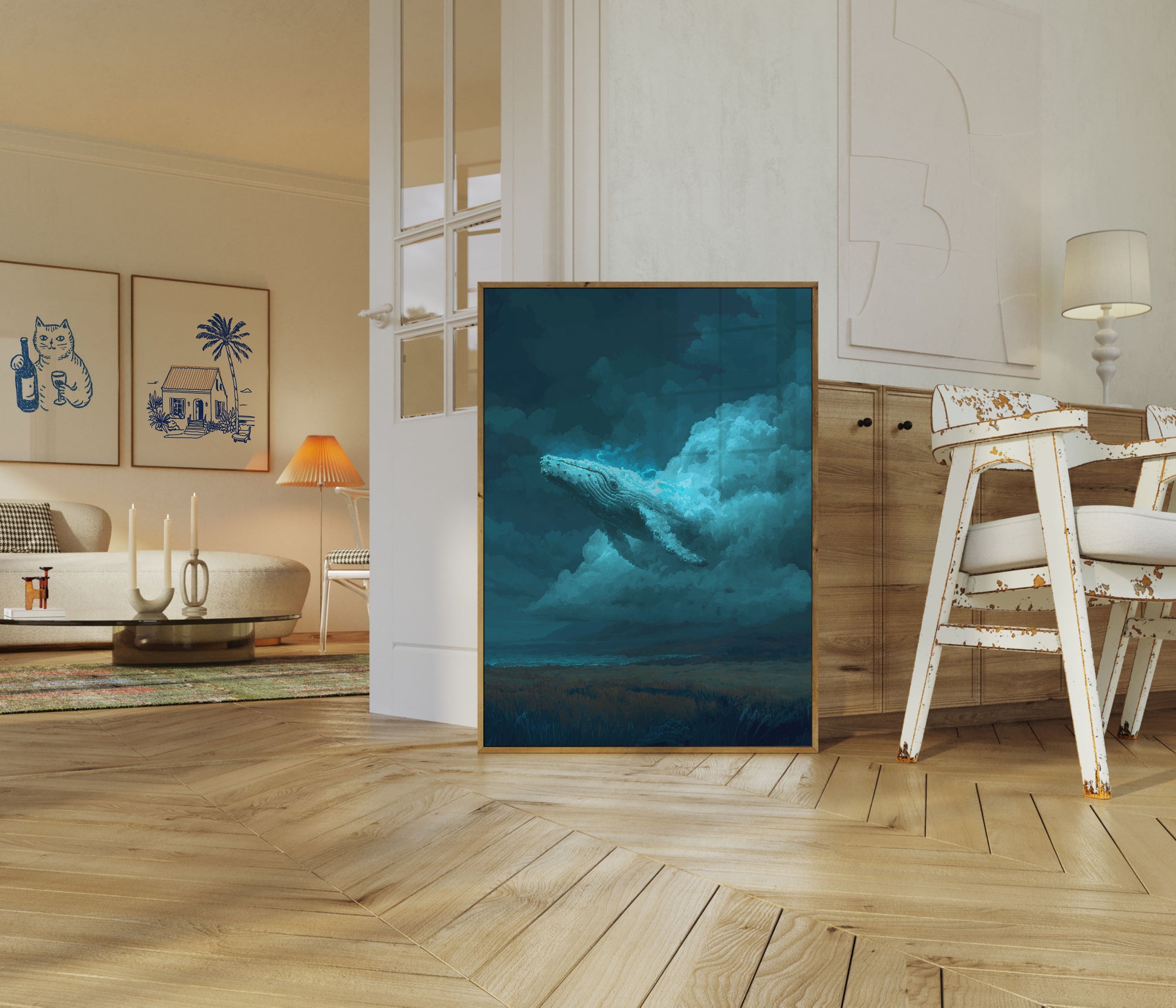 A mesmerizing digital artwork depicting a luminescent blue whale soaring majestically through a dark, stormy cloud landscape. The ethereal creature appears to be floating or swimming through the turbulent sky, its glowing blue form creating a stark contrast against the deep teal and navy cloud formations. This surreal image blends natural elements with a dreamlike fantasy, inviting viewers into a world where the impossible becomes possible.