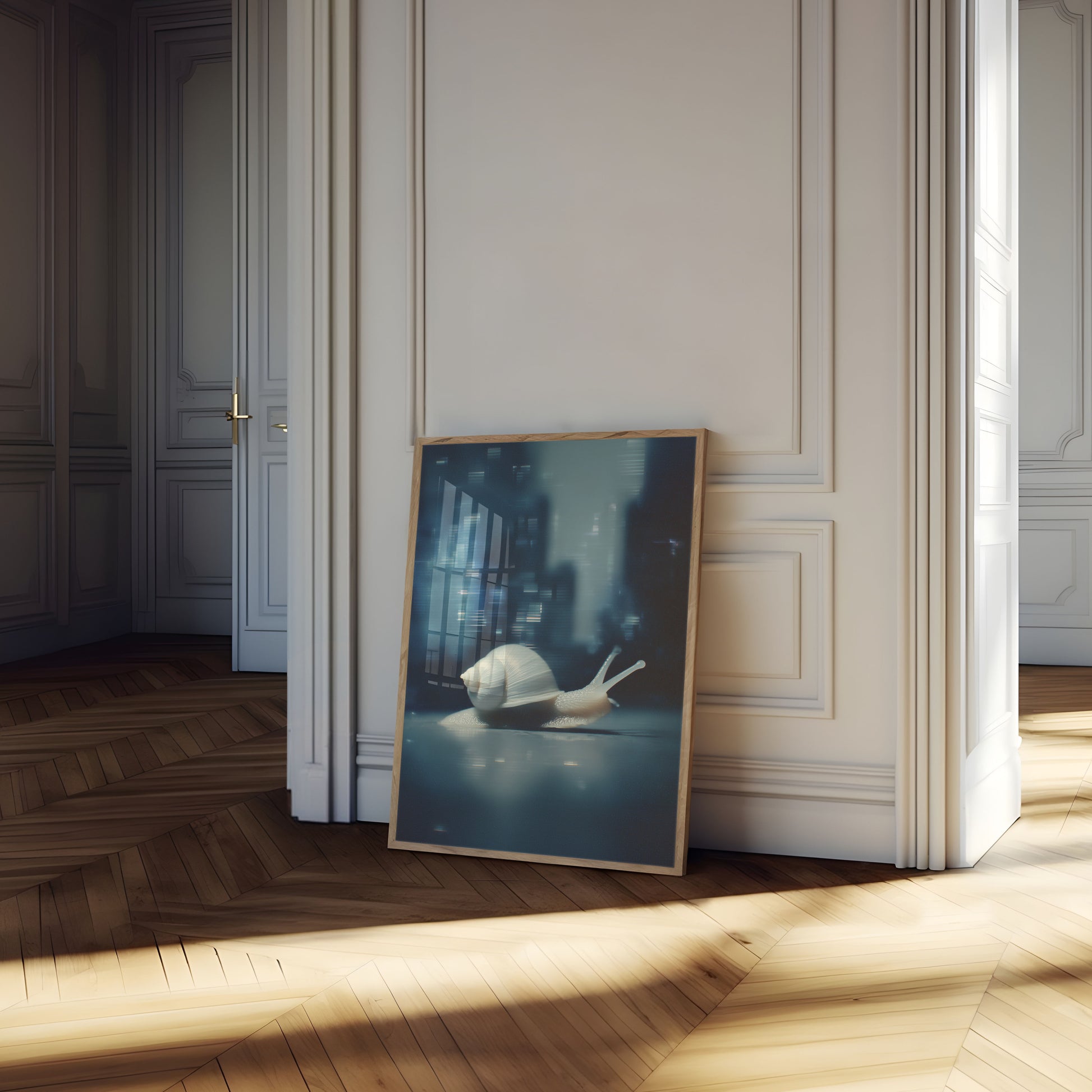 A mesmerizing artistic composition featuring a pristine white snail against a dreamy, pixelated blue urban backdrop. The soft focus and ethereal digital effect create a surreal landscape where nature's delicate movement contrasts with an abstract cityscape. This poster captures a moment of serene stillness amid technological complexity.