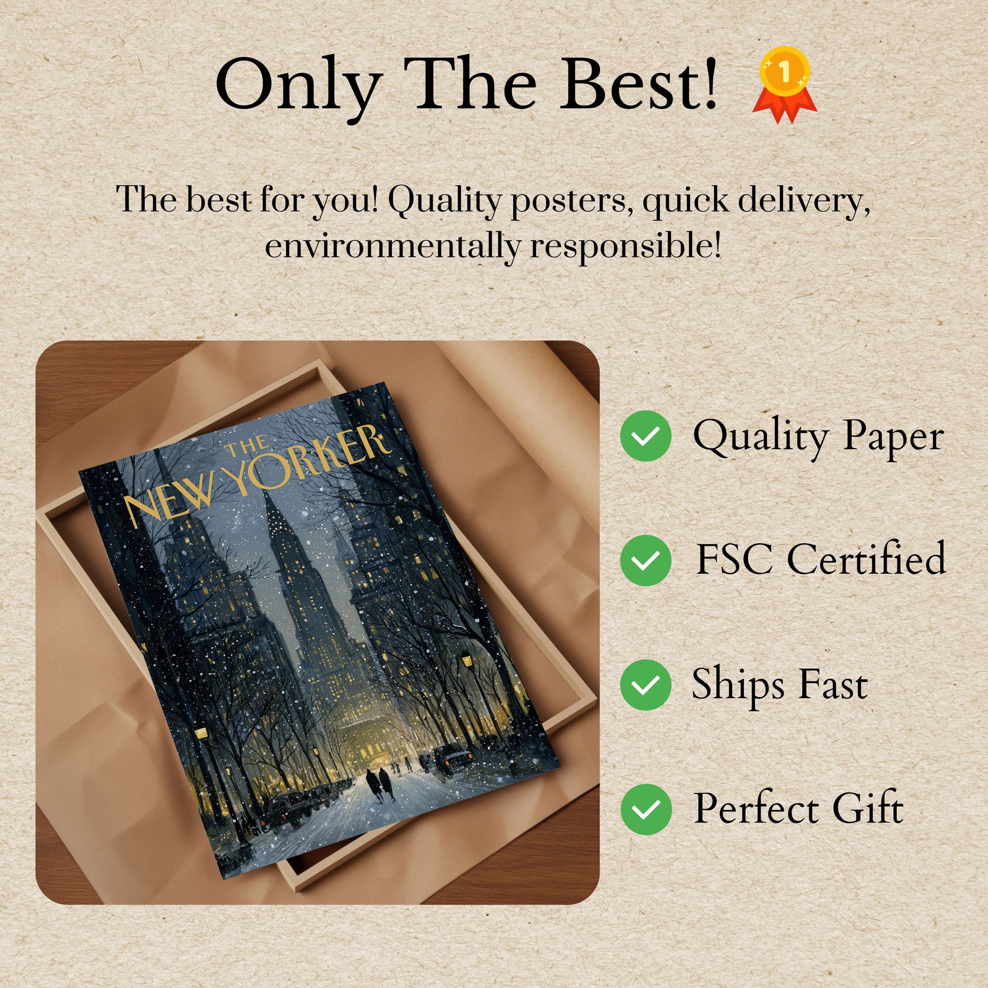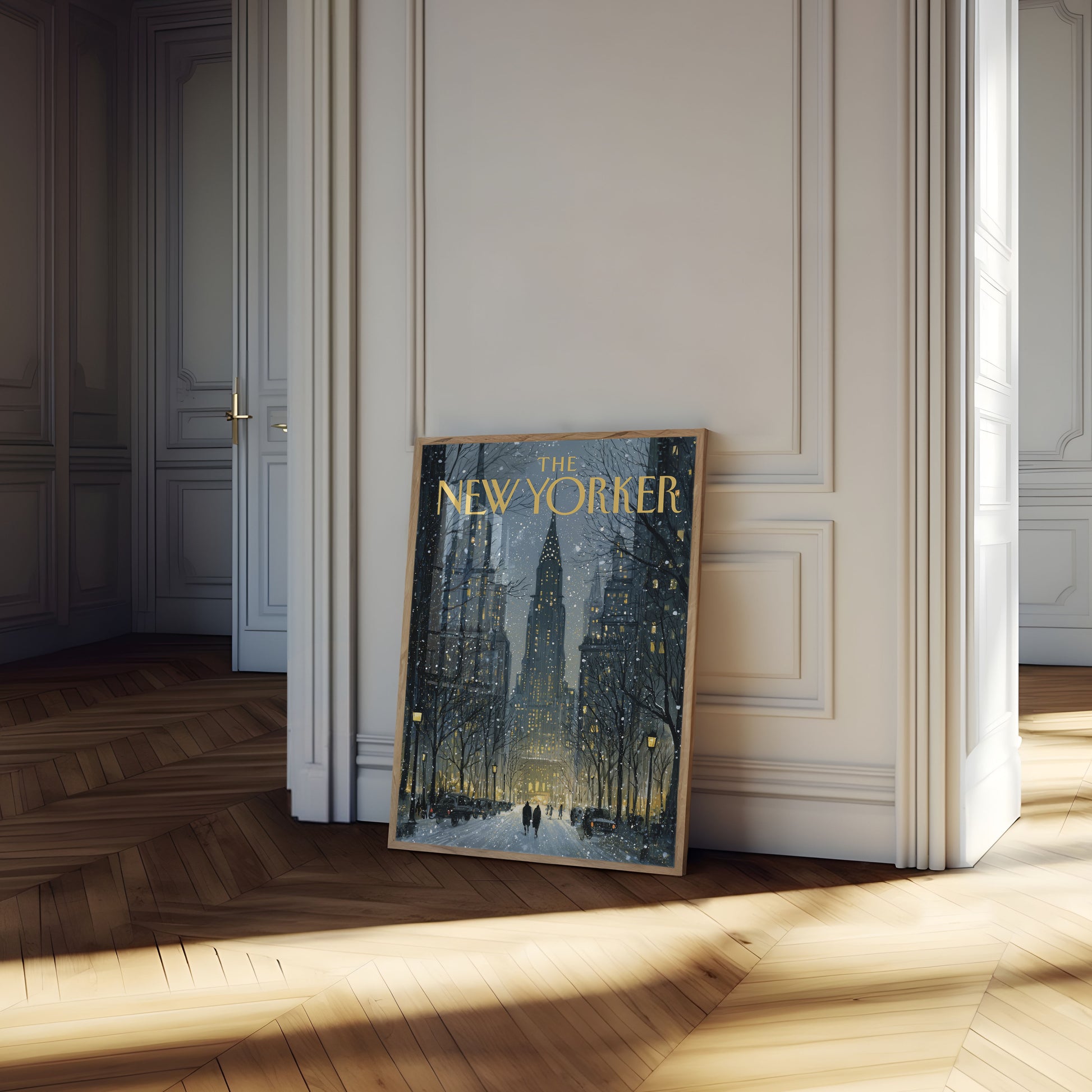 Immerse yourself in the enchanting winter landscape of New York City, where snowflakes dance between elegant streetlamps and towering skyscrapers. This captivating New Yorker magazine cover poster captures the magical essence of a quiet winter evening, with the iconic Chrysler Building glowing softly in the background and silhouetted figures walking a snow-covered street. The artistic rendering transforms the bustling city into a serene, atmospheric scene of urban poetry.