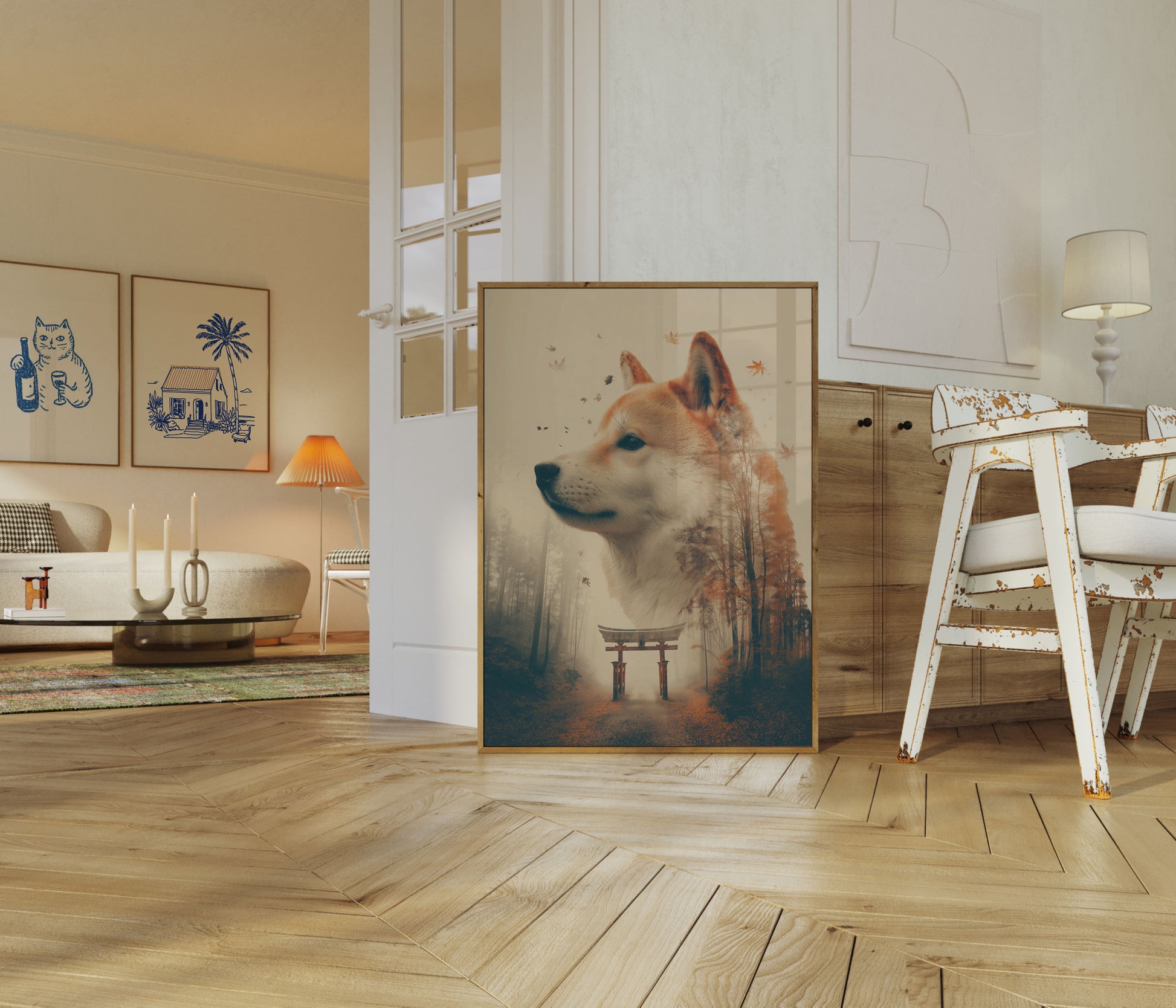 A breathtaking fusion of a majestic Shiba Inu and a misty Japanese forest landscape, capturing the ethereal beauty of autumn. Delicate maple leaves dance around the dog's noble profile, blending seamlessly with the serene woodland scene and traditional torii gate. This stunning artwork evokes a sense of tranquility and mystical connection between nature and spirit.