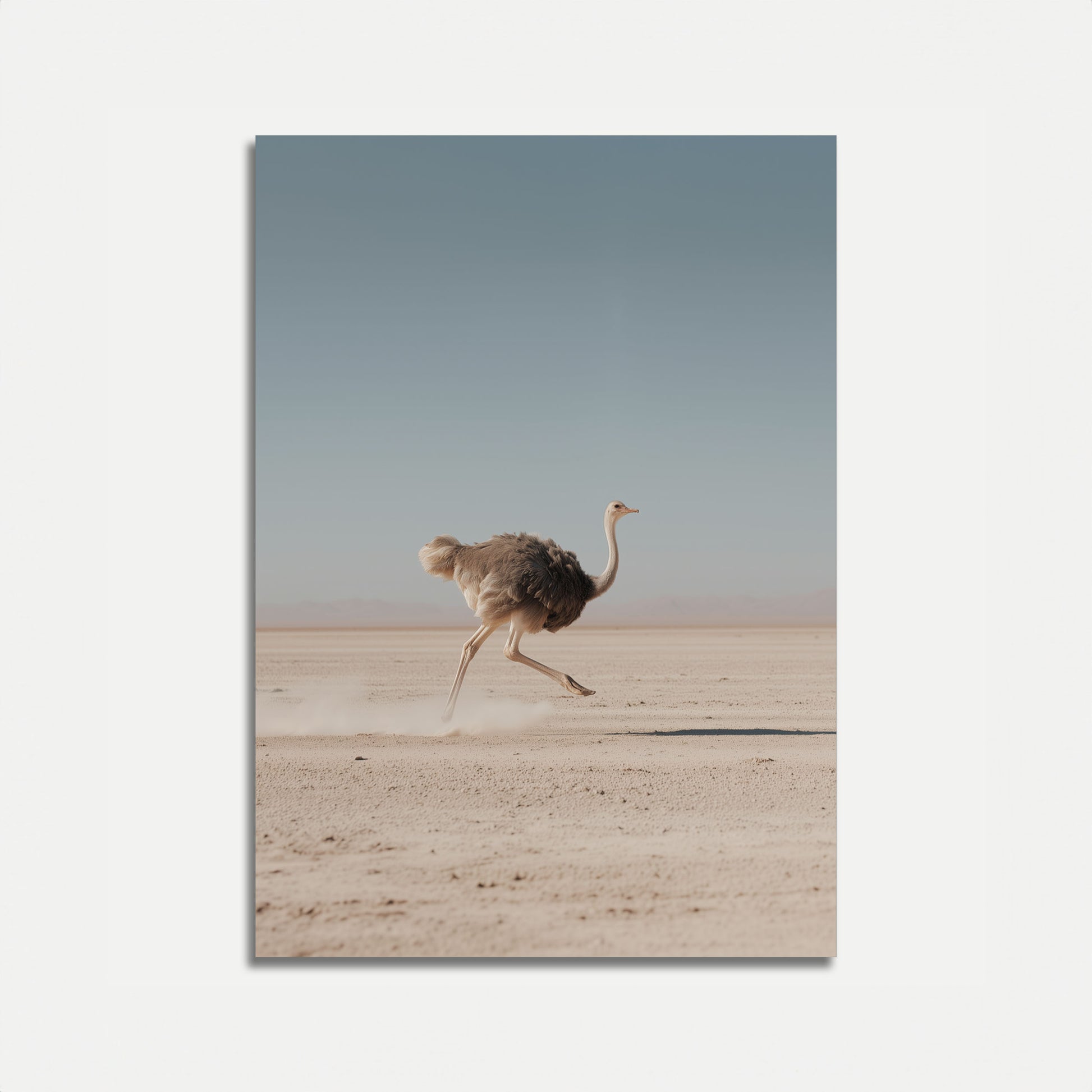 A majestic ostrich captured mid-stride across a vast, minimalist desert landscape. The bird's powerful legs kick up dust against a serene blue-gray sky, showcasing the raw beauty and dynamic movement of this incredible creature. The image captures the essence of freedom and grace in the stark, expansive wilderness.