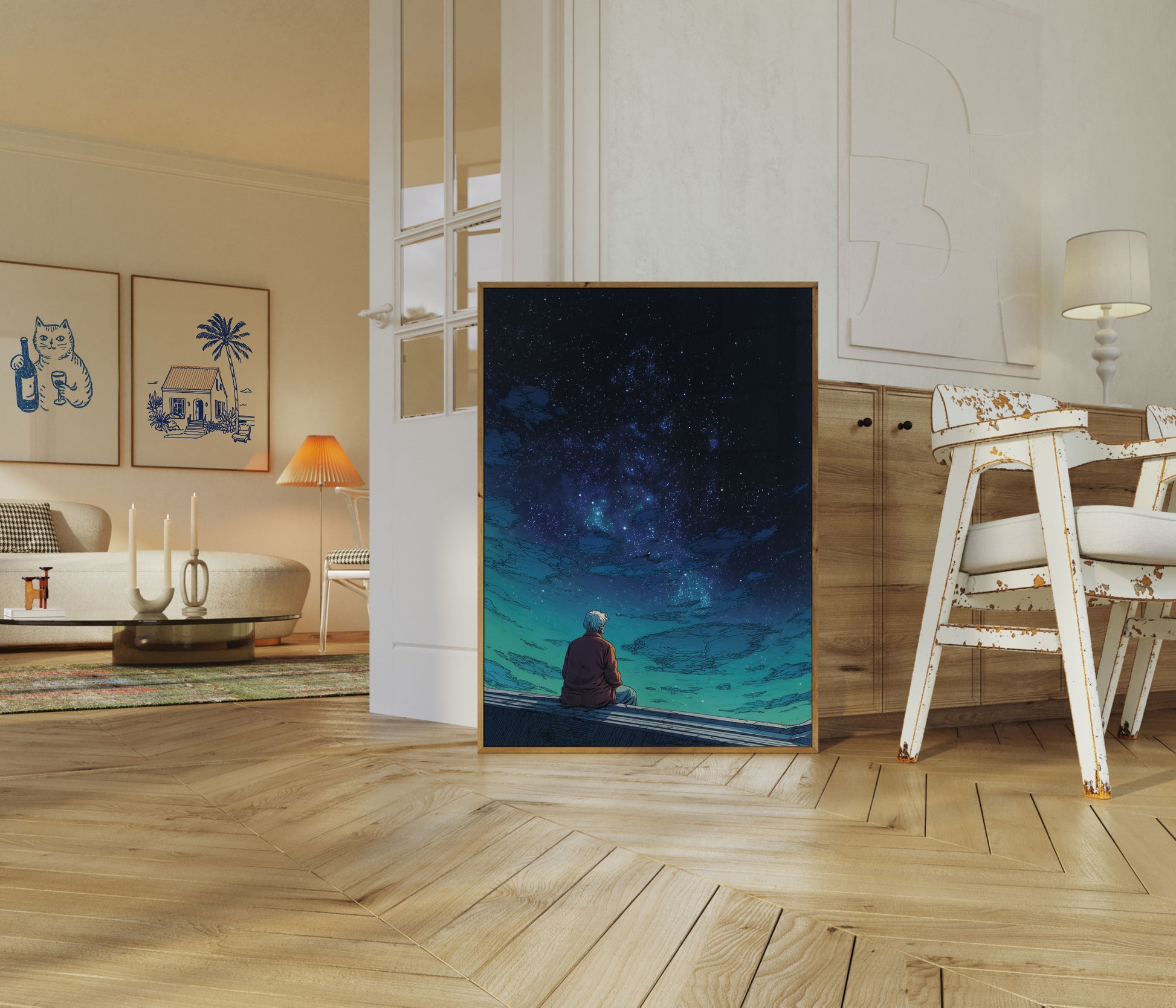 A solitary figure gazes into the breathtaking expanse of a star-filled night sky, capturing a moment of profound cosmic wonder. The deep blues and turquoise hues create a mesmerizing backdrop of celestial beauty, with the Milky Way stretching across the heavens in brilliant detail. This introspective scene invites viewers to pause and reflect on the vastness of the universe.